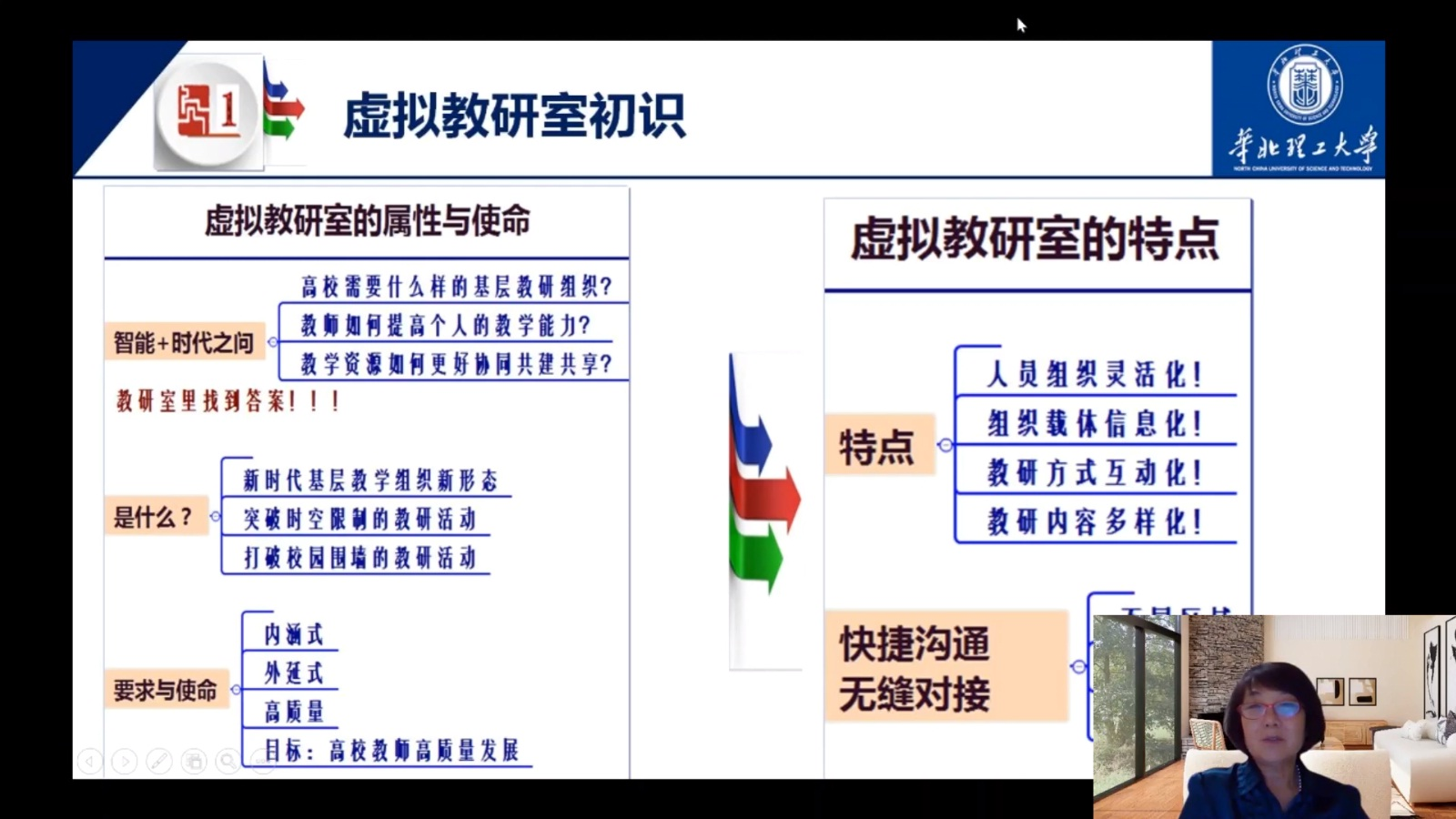 本次培训专家分别来自北京师范大学、上海交通大学等名校,围绕教学方法、教学创新、教学设计、学习评价和虚拟教研五个方面展开了精彩的讲授。《基于翻转课堂的同伴教学法》讲座中张萍教授系统分析了传统教学方法的利弊,提出了新时代教师发展和人才培养的新要求,尤其是培养具有创新能力与合作精神的人才;《信息化背景下教学创新设计的思考与实践》讲座中许亮教授讲到,基于信息化BYOD教学手段的合作学习模式与科学评价机制是新时代高等教育改革势在必行的选择;《教学设计:从朴素经验到效能可期的三层跃迁》讲座中,周付安教授提出了教学活动不是对教材内容的重复,而是基于精妙设计的重构,从而实现学生从知识到能力与情感的跃迁;学习效果评估也是驱动学生能力跃迁的核心因素之一,《学习评价:课堂学习效果评价》讲座中,邱意弘教授介绍了医学教育的评估框架,衡量学生的知识掌握情况、课堂角色胜任力和课堂行为表现等方面,将预期学习成果与教学评估合轨,设置表现型任务量规开展课堂活动评估,优化试题设计与分析保障测验与考试评价,在形成性评价和总结性评价中体现布鲁姆认知层次;信息化的教学手段催生了教研室这一基层教学组织的新变革,《虚拟教研:从大学数学课程建设到虚拟教研室建设的跋涉之旅》讲座中,刘春凤教授以华北理工大学大学数学课程群虚拟教研室的构建为范例,介绍了虚拟教研室的建设理念与行动方案。基于虚拟教研室开展跨地区、多层次的教研活动,可以实现跨校资源的互联互通和共建共享,进一步推进现代信息技术与教育教学的深度融合,打造教学和教师发展共同体。