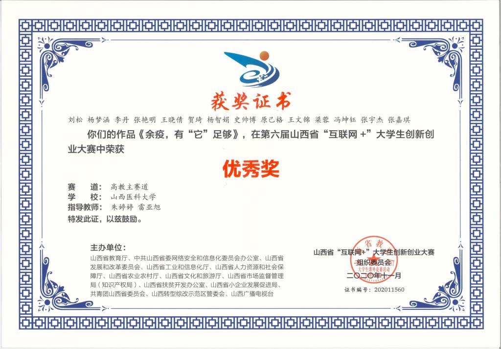 近日,2020年第六届山西省“互联网+”大学生创新创业大赛结果公布,必赢作品《余疫、有它足够》在高教主赛道中荣获山西省优秀奖,并在山西医科大学“互联网+”大学生创新创业大赛中荣获二等奖。