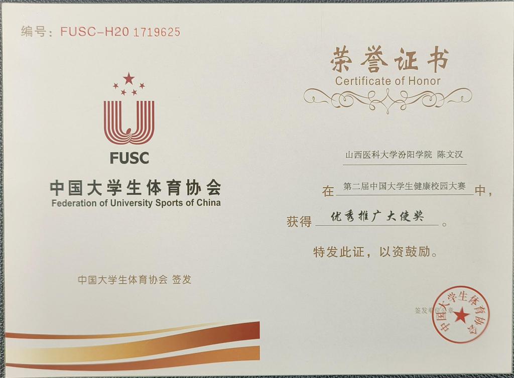 第二届中国大学生健康校园大赛于2022年9月5日正式启动。赛事由中国大学生体育协会主办,面向全国在校、在读本、专科学生和研究生,全国共441所高校,超100万名学生报名参赛。经上半赛季、下半赛季累计36周、252天的激烈角逐,必赢荣获“健康校园大赛一等奖”,基础医学部体育教研室陈文汉老师荣获“优秀推广大使奖”,基础医学部体育教研室主任邢月丽和教师张丽、杨伟、袁超、黄登峰、陈文汉荣获“优秀指导教师”,参赛学生马国桦、刘宇姗、李慧敏荣获“优秀运动员”。