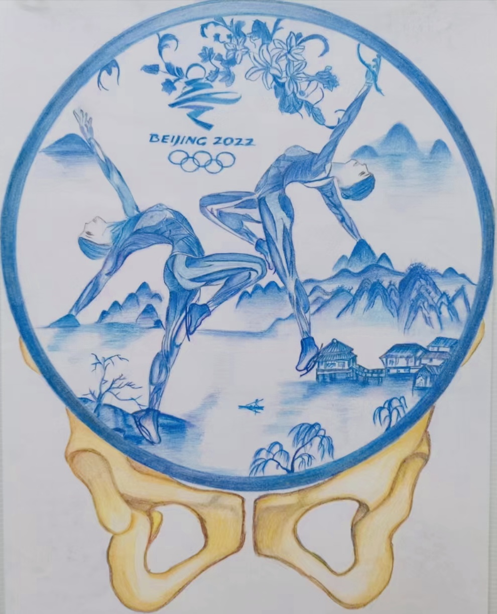 《青“花”》设计新颖、巧妙,由青花瓷盘和耻骨为原型的底座构成。作品以冬奥会为主题,展现了我国运动强项花样滑冰运动员肌肉线条的优美,并融入亭台楼阁和山水花草,赋予灵动和变幻。整幅画以蓝色为主调,将中国传统画法和医学解剖完美结合,体现了瓷中名器青花瓷的惊艳美感。