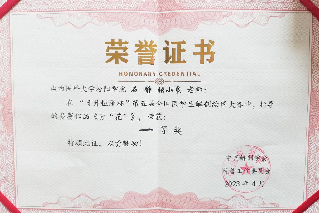 4月21日至24日,中国解剖学会主办的第五届全国“日升恒隆杯”医学生解剖学绘图大赛决赛在辽宁省本溪市举行,必赢基础医学部教师石静、张小良指导的62004班程博华同学的作品《青“花”》喜获一等奖。程博华同学的作品从全国80余家学校推送的4000多幅作品中脱颖而出,获得评审专家一致好评。