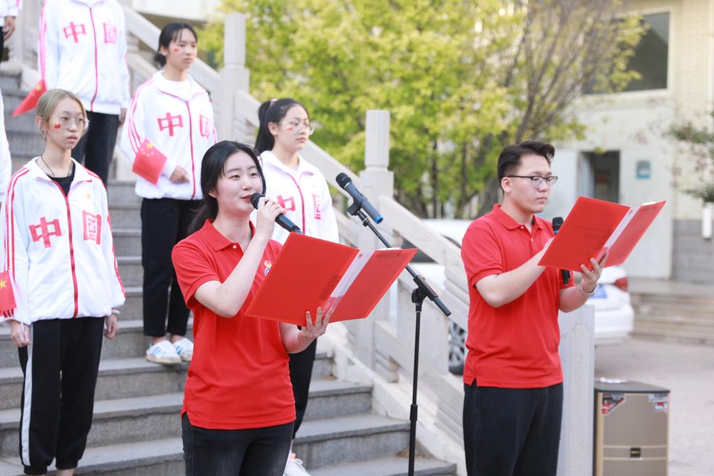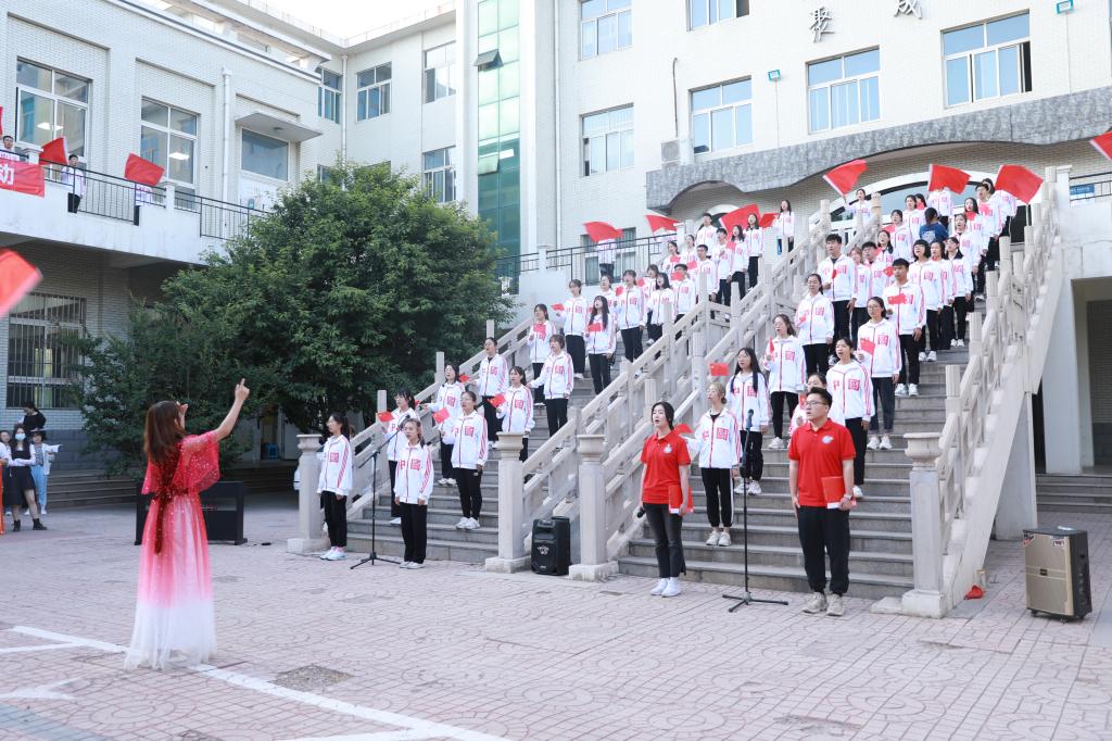 聚成楼下,佩戴团徽,手持小国旗,身穿班服,同学们以快闪的形式入场。随着《没有共产党就没有新中国》的伴奏,主持人92002班组织委员李雨彤同学和92001班组织委员侯玉泉同学介绍了现场嘉宾,宣布了本次红歌会的主题,活动正式开始。首先,汤文婷同学和王斌同学为大家带来了精彩的诗朗诵《青春为党歌唱》,用饱含深情的话语表明了我辈青年要传承党的精神,追随党的方向,为实现中华民族伟大复兴贡献力量的雄心壮志。