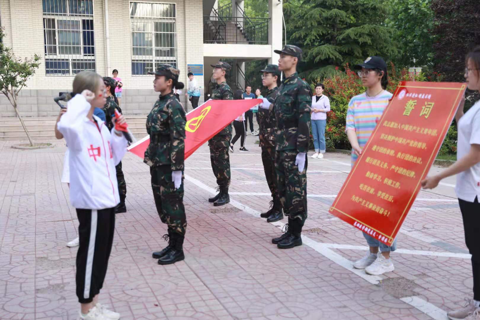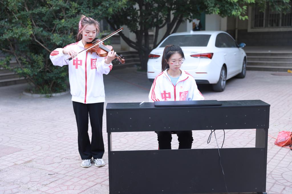 随后,主持人向大家介绍了共青团团歌《光荣啊,中国共青团》的背景,使同学们回想起时代青年不屈不挠、忧国忧民、敢于斗争、甘于奉献的伟大爱国主义精神,同学们洋溢着青春的朝气,尽情地歌唱,立志要继承五四精神,发挥青年的作用,为祖国发展而奋斗。孔小丫同学的钢琴和吕佳璐同学的小提琴伴奏将现场的氛围推向高潮。歌毕,由国旗护卫队的队员请团旗,920班团总支书记李嘉鑫同学带领全体同学重温入团誓词,同学们佩戴团徽,再次在鲜红的团旗面前庄严地举起右拳。最后,各位领导老师入队,与同学们一起高唱《我和我的祖国》。