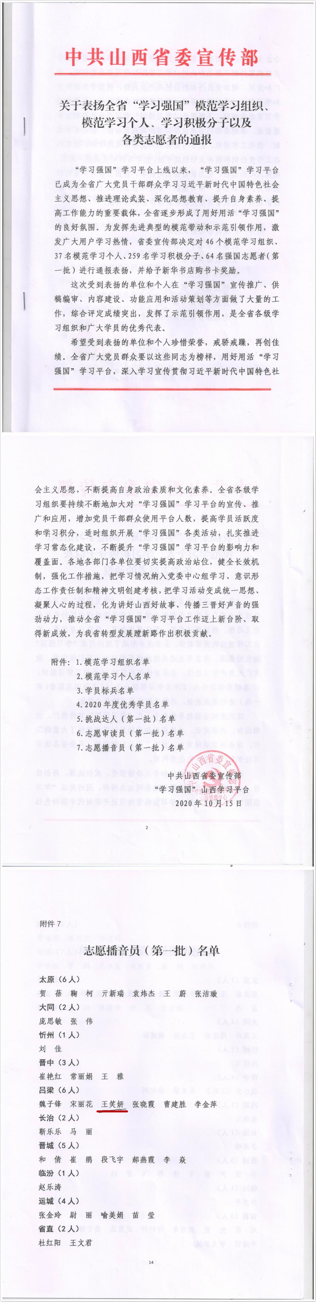 必赢党委组织部王笑妍同志受“学习强国”山西学习平台表彰被聘任为播音志愿者