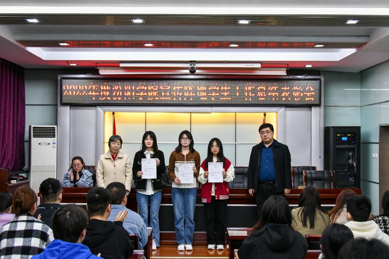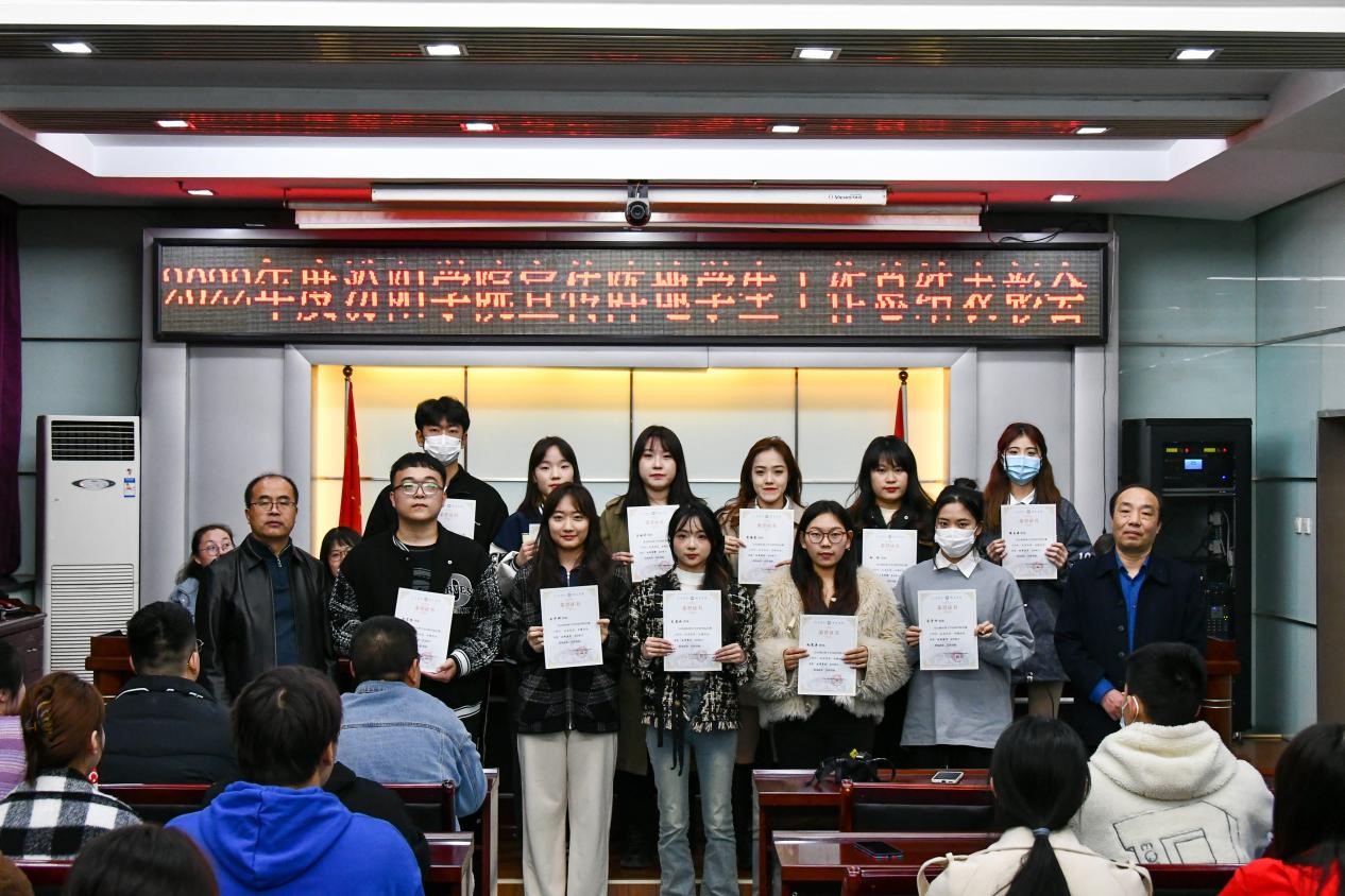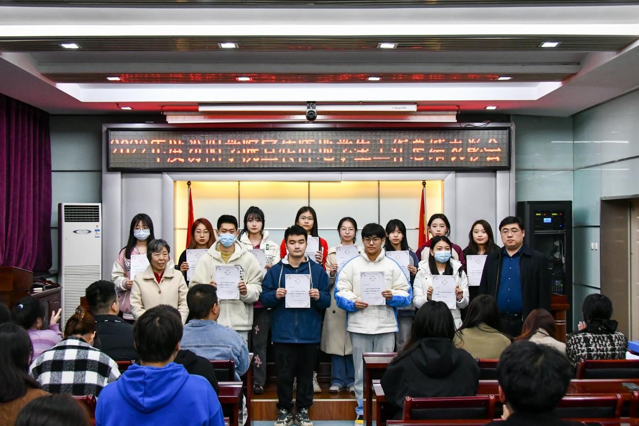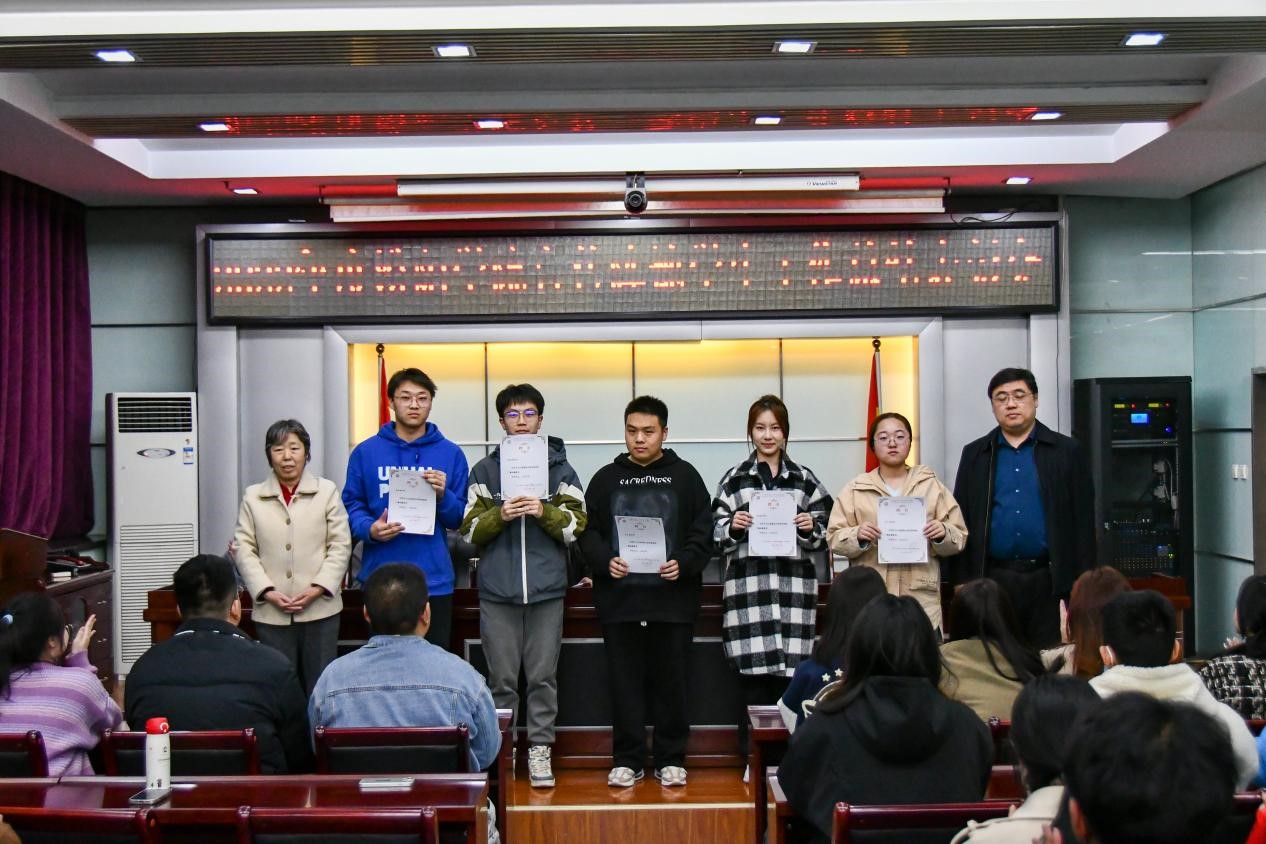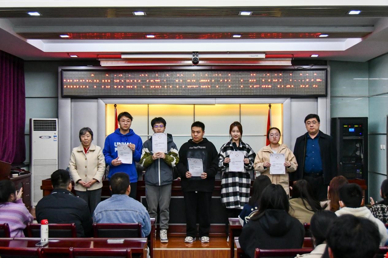 紧接着,张超老师宣读了2022年26名宣传阵地学生聘任名单,樊部长和双部长为同学们颁发聘书。武霞老师宣读2022年39名宣传阵地优秀播音员、讲解员、创作员、编辑、通讯员荣誉获得者名单,张主席、常处长、樊部长、双部长为同学们颁发证书。