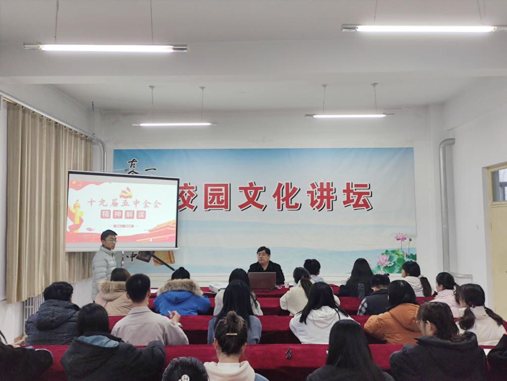 11月25日,思政部主任樊瑞晶为校习近平新时代中国特色社会主义思想学习会成员宣讲党的十九届五中全会精神。