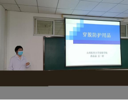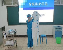随后岳一婷老师进行了现场实操演练,从用物准备、穿脱步骤、卫生手消毒细节以及注意事项等方面为大家进行了演示,并对穿脱过程中的重点细节着重做了强调。在穿脱过程中,岳一婷老师通过与在场师生互动提问,为其答疑解惑,使现场气氛热烈,加强了老师和同学们对穿脱流程的理解,使大家更加熟悉防护流程,从而提高了大家的应急能力并增强了防护意识。