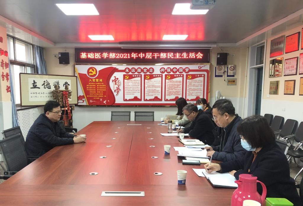 根据《中共山西医科大学汾阳学院委员会关于开好 2021 年中层处级党员领导干部党史学习教育专题民主生活会的通知》(山医大汾院党字(2021)121号)的精神,1月6日上午10时,基础医学部党总支在诚明楼四楼会议室召开系部班子党史学习教育专题民主生活会。会议由党总支书记姚万军主持,基础医学部全体班子成员参加,第三、第四党支部书记和组织员列席。基础医学部联系领导、校党委副书记、院长孟小平到会督导。