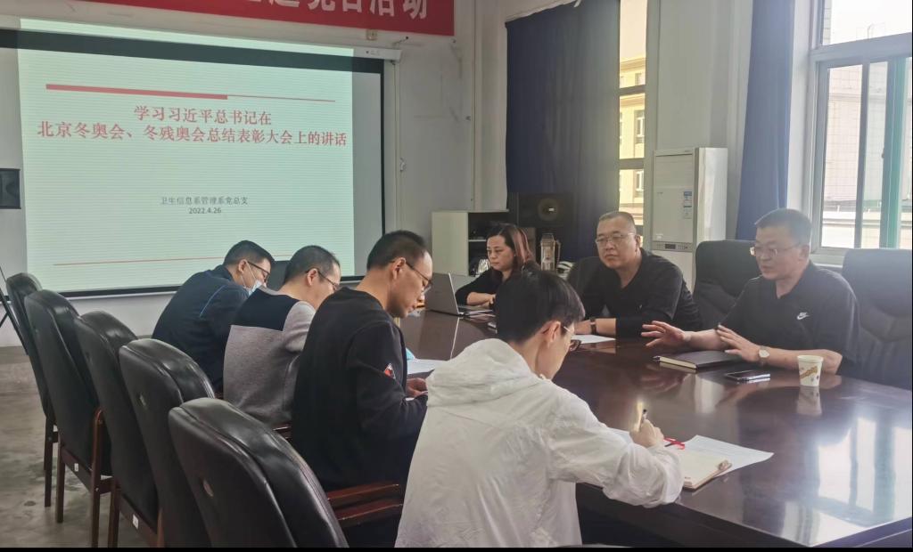 按照山西医科大学汾阳学院党委要求,4月25日下午4点30分,卫生信息管理系党总支在聚诚楼四楼系会议室召开关于《习近平总书记在北京冬奥会、冬残奥会总结表彰大会上的讲话》中心组理论学习会议。卫生信息管理系党总支书记张烨主持学习,系党总支理论学习中心组全体成员参加。机关党总支书记温继军到会督导。