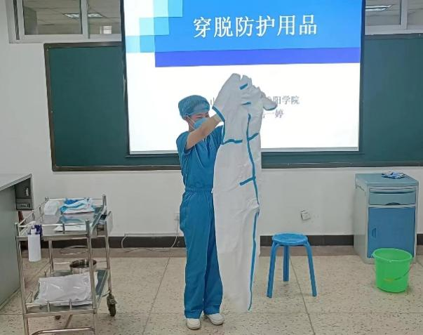 随后,岳一婷老师进行了现场实操演练,从用物准备、穿脱步骤、卫生手消毒细节以及注意事项等方面为大家进行了演示,并对穿脱过程中的重点细节做了重点强调。在穿脱过程中,岳一婷老师通过与在场师生互动提问,为其答疑解惑,加强了老师和同学们对穿脱防护服流程的理解,从而提高了学习效果。