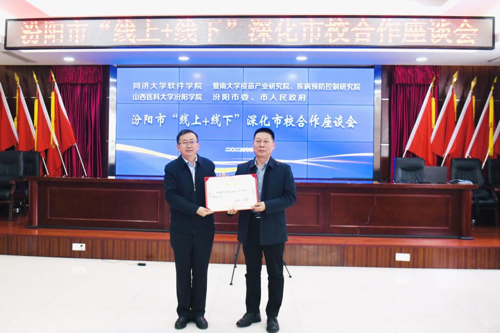 座谈交流结束后,汾阳市委常委、组织部长李永鑫向闫敬来等4名专家学者颁发了“汾州顾问”聘书。闫敬来书记为汾阳市人民医院大学生实习实训基地、科研成果转化基地授牌。