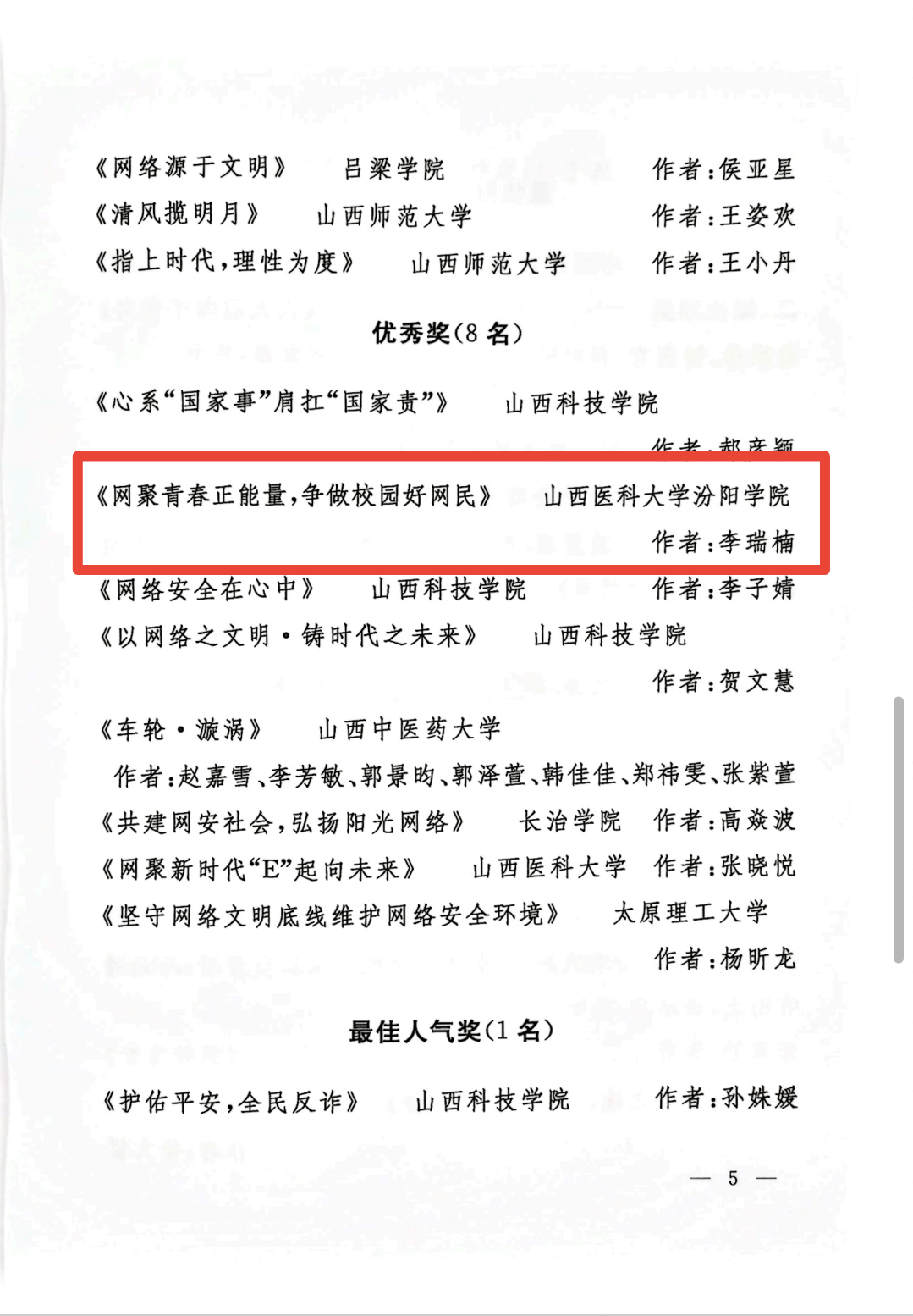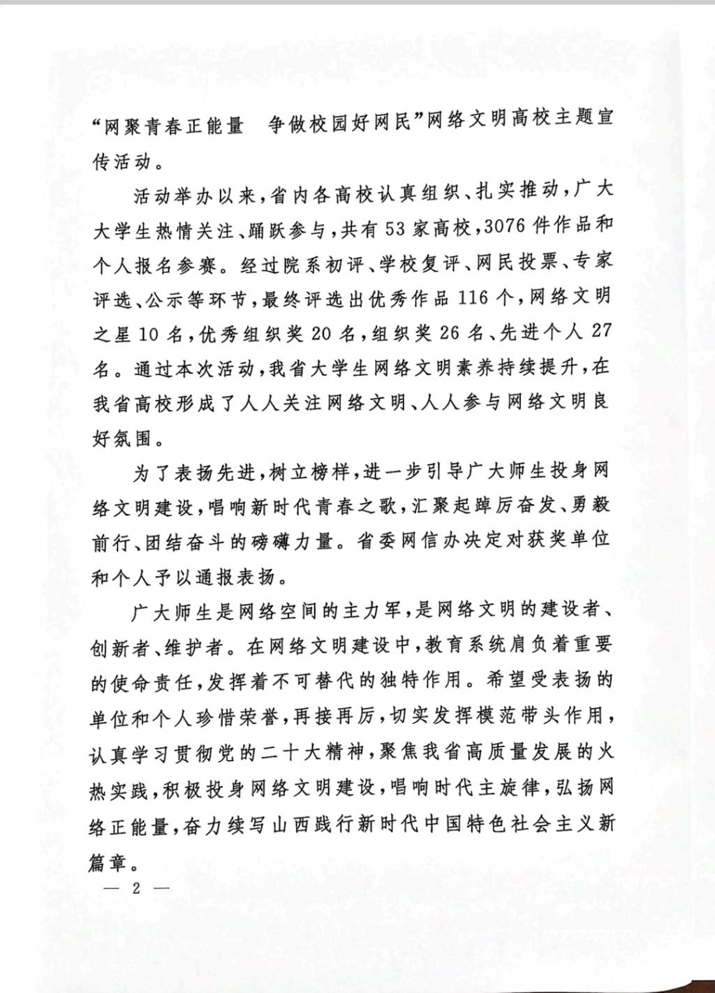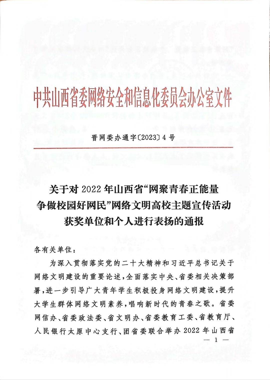 喜报!必赢在2022年山西省“网聚青春正能量,争做校园好网民”网络文明高校宣传活动中荣获佳绩