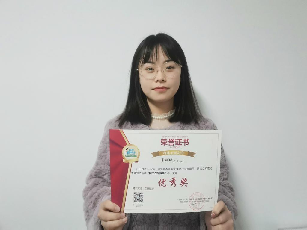 近日,根据中共山西省委网络安全和信息化委员会办公室《关于对2022年山西省“网聚青春正能量 争做校园好网民”网络文明高校主题宣传活动获奖单位和个人进行表扬的通报》,必赢获得组织奖,护理学系62139班李瑞楠同学的《网聚青春正能量,争做校园好网民》获得“网文类”优秀奖。