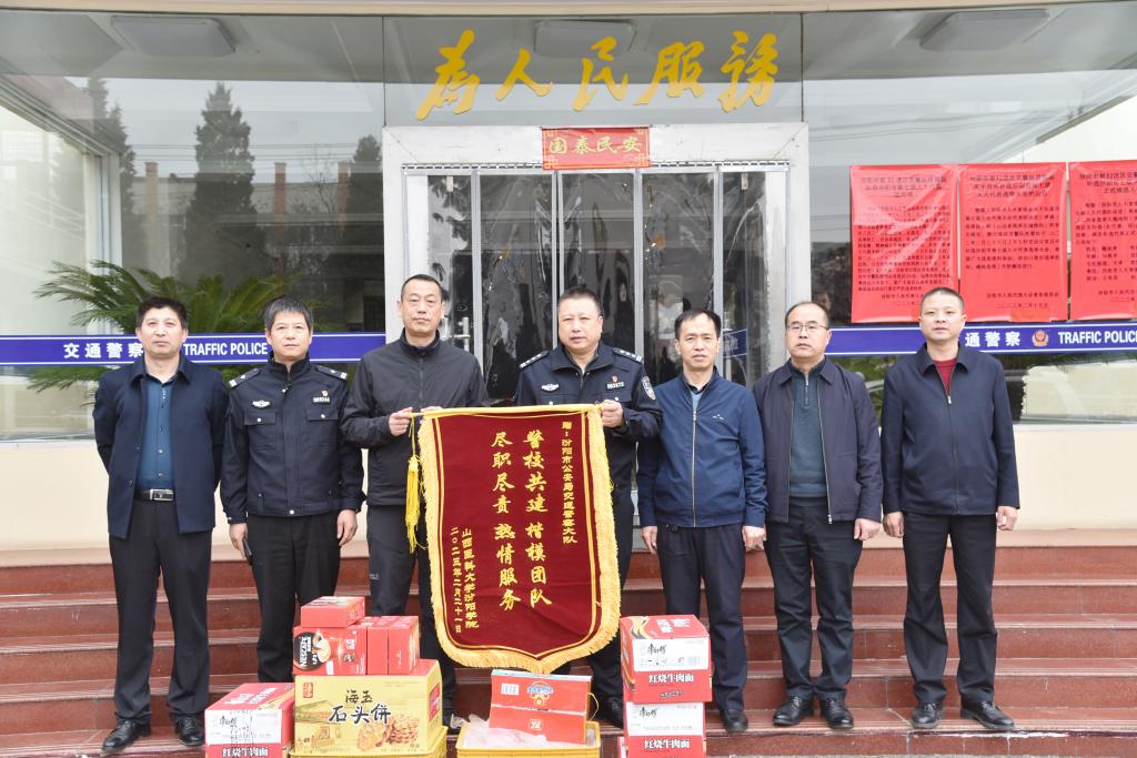 王伟副书记、李荣江副院长代表学校领导、全体师生对汾阳市交警大队、城区二中队维护必赢校园周边安全稳定、支持“平安校园”建设,民警们坚守岗位、为必赢两个校区间路段安全通行保驾护航表示衷心感谢,并赠送了锦旗和慰问品。