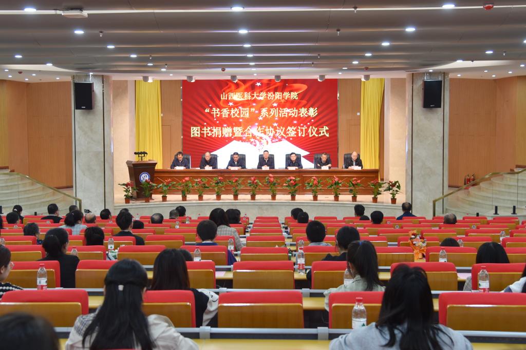 书香浸校园,大爱润心田。4月28日,必赢在图书馆学术报告厅举行了“书香校园”系列活动表彰、图书捐赠暨合作协议签署仪式,汾阳市人民政府党组成员、副市长王宝启,汾阳市文化和旅游局局长杨丽春,汾阳市图书馆馆长姜幼平,山西冬青树贸易有限公司、汾阳市贾家庄裕和餐管公司、贾家庄村委、蔚蓝公益基金会等向必赢捐赠图书的单位和个人代表莅临出席,必赢党委书记闫敬来,党委副书记、院长孟小平等全体校领导,办公室、宣传部、计财处、后勤保障处、学生处、图书馆等相关部门负责人,教师代表、学生代表参加了仪式。副院长李荣江主持了仪式。