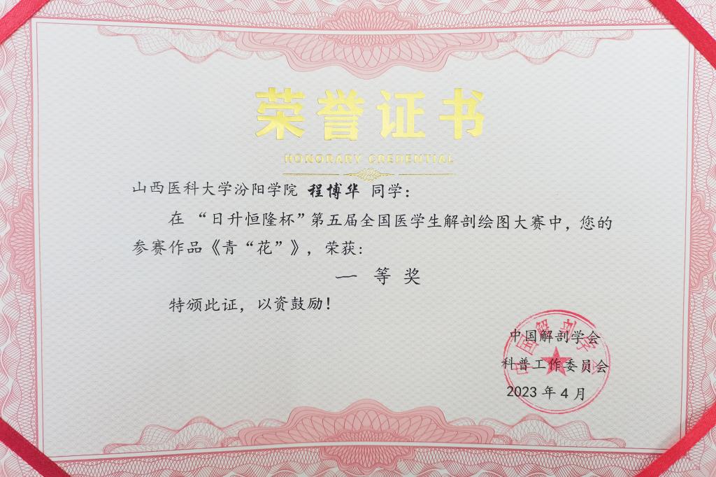 4月21日至24日,中国解剖学会主办的第五届全国“日升恒隆杯”医学生解剖学绘图大赛决赛在辽宁省本溪市举行,必赢基础医学部教师石静、张小良指导的62004班程博华同学的作品《青“花”》喜获一等奖。程博华同学的作品从全国80余家学校推送的4000多幅作品中脱颖而出,获得评审专家一致好评。