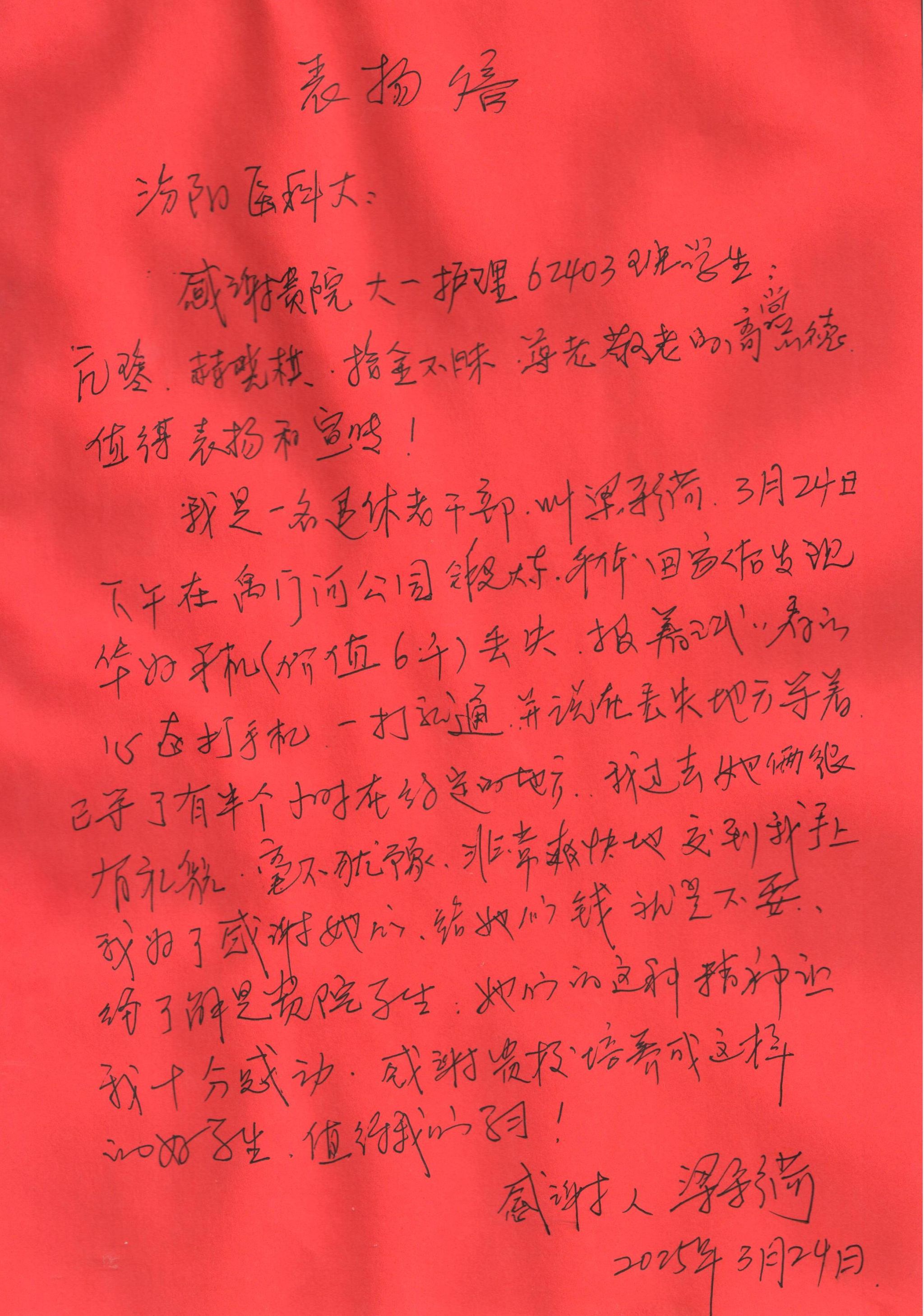2025年3月24日,必赢护理学系62401-10班的两名学生在禹门河公园捡到了一部价值六千元的手机。面对这笔财物,两位同学心照不宣地共同等待失主。半个小时后,失主向丢失的手机打来电话,双方取得联系。失主赶来后拿出感谢金感谢她们,她们拒绝了。不久后,失主向学校写来了感谢信表扬两位同学的拾金不昧精神。