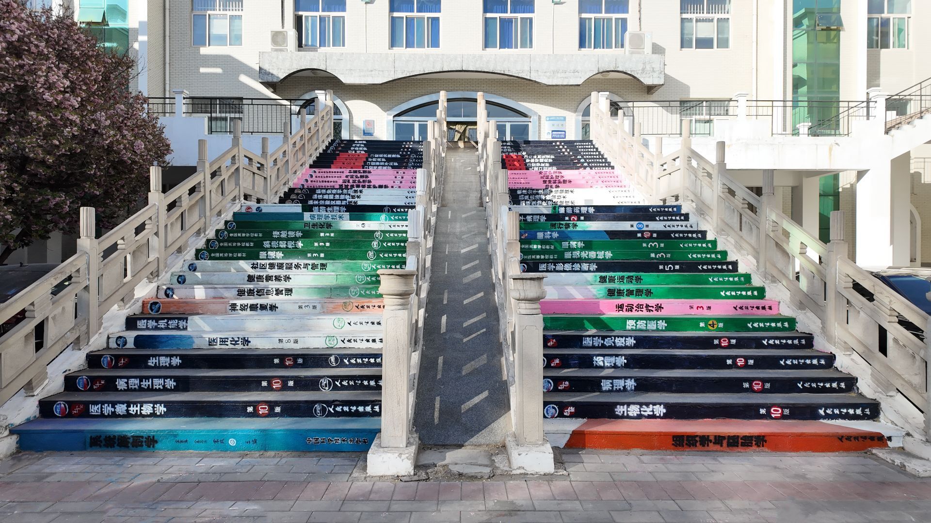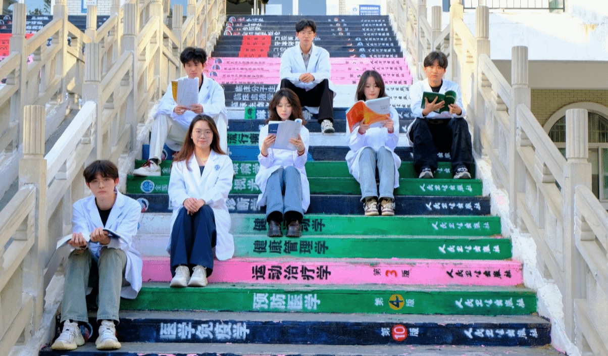 为助力第四届全民阅读大会,构建“书香校园”,在校团委的精心组织、用心策划下,来自学生社团的25名学生耗时5天,以医学课本为元素,通过手绘的方式在62级台阶上绘制了“医路向上”为主题的校园景观,使平常刻板的台阶焕发生机,成为了校园内一道亮丽的风景线,吸引了众多学子驻足拍照。