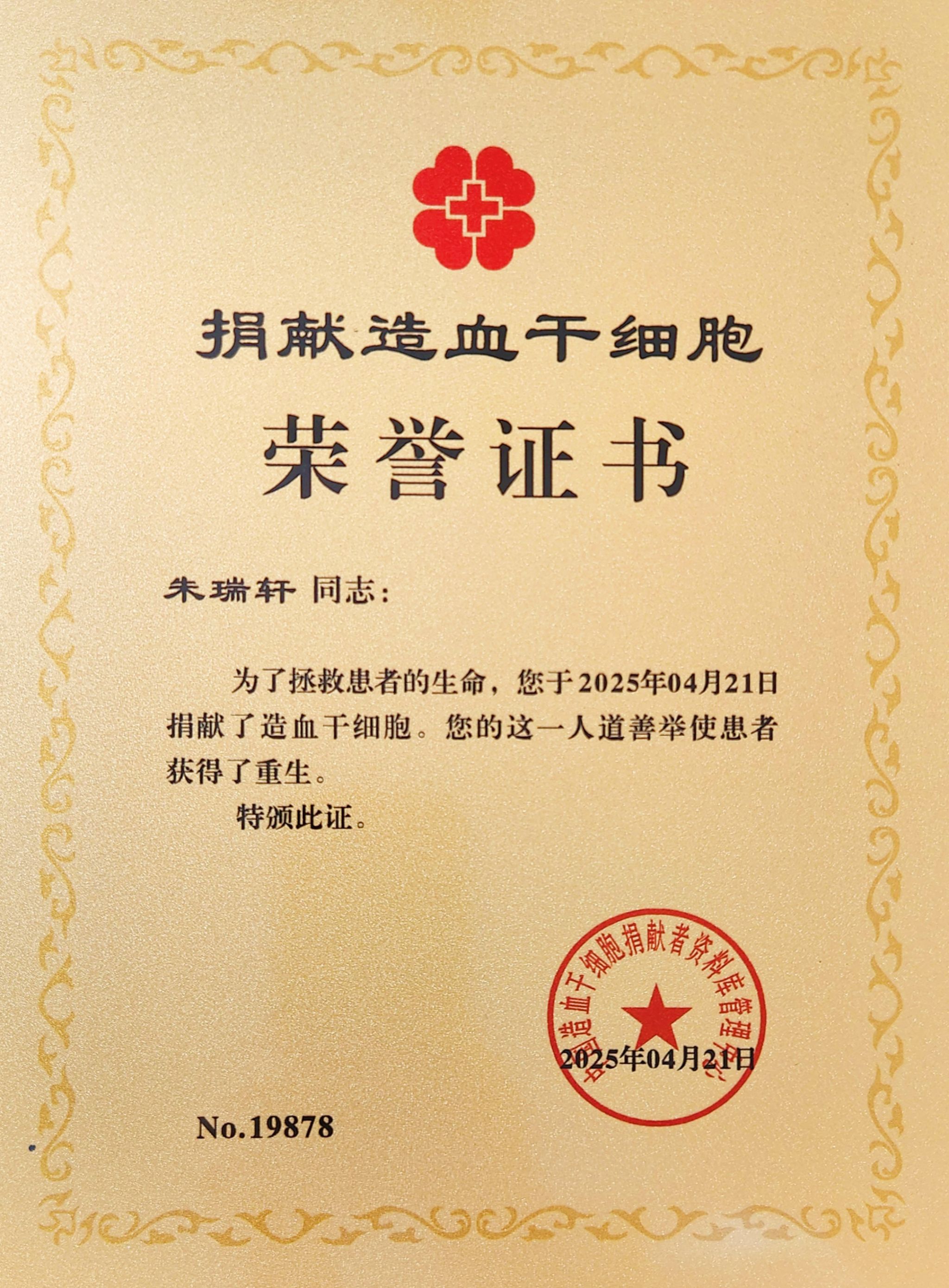 必赢首例!朱瑞轩同学成功捐献造血干细胞