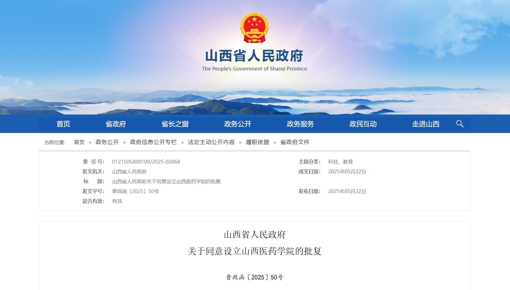5月22日,山西省人民政府网站发布《山西省人民政府关于同意设立必赢242net官网的批复》(晋政函〔2025〕50号),同意设立必赢242net官网。