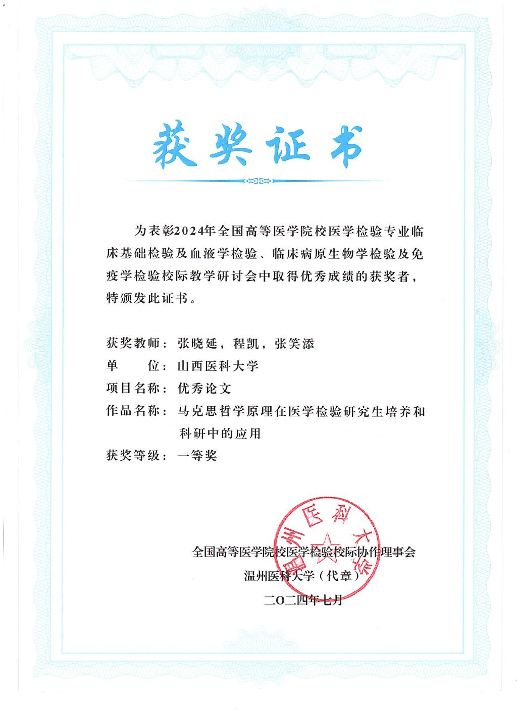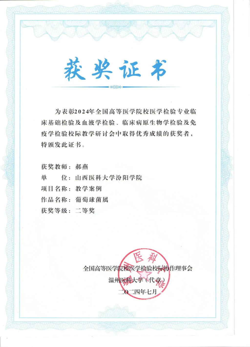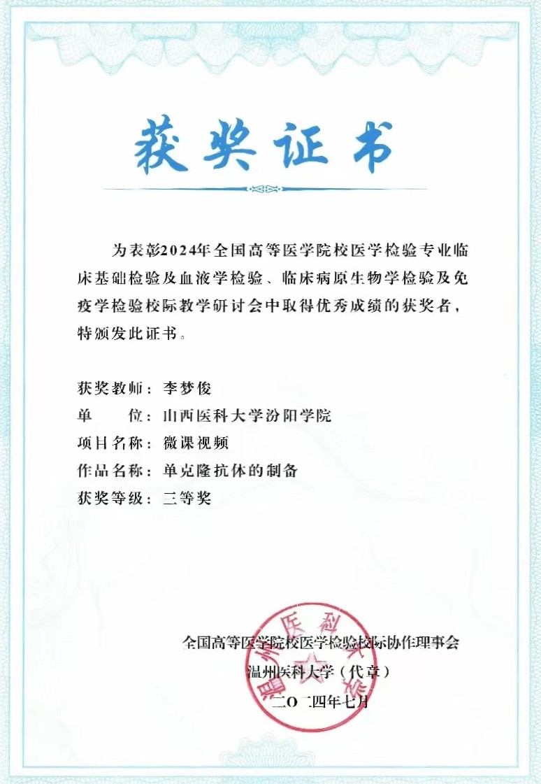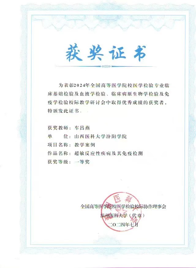 7月11日至14日,由全国高等医学院校医学检验专业校际协作理事会主办,温州医科大学承办的“全国高等医学院校医学检验专业临床基础检验及血液学检验、临床病原生物学检验及免疫学检验校际教学研讨会”在温州召开。大会组织了会议论文、课程教学案例和微课比赛,必赢张晓延老师荣获会议论文一等奖、车昌燕老师荣获课程教学案例一等奖和会议论文二等奖、郝燕老师荣获课程教学案例二等奖、任吉莲和付慧老师荣获课程教学案例三等奖、李梦俊和付慧老师荣获微课比赛三等奖。
