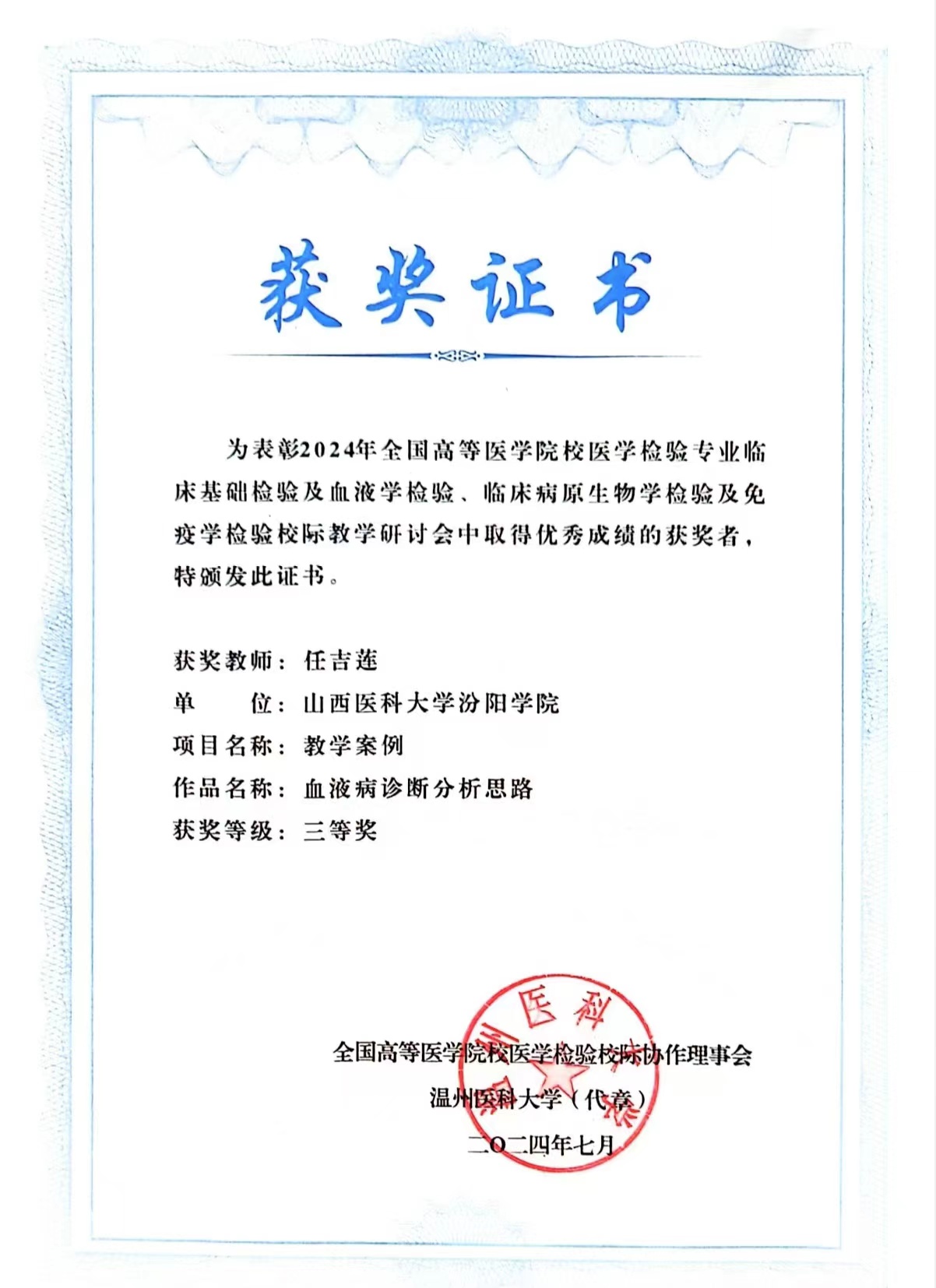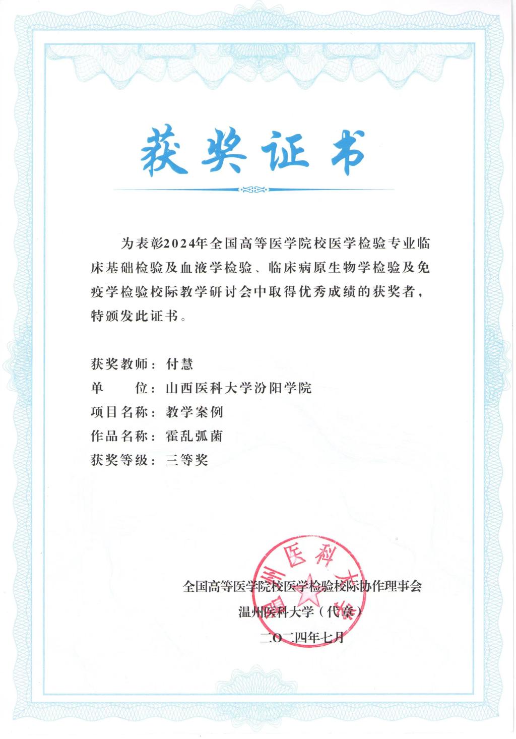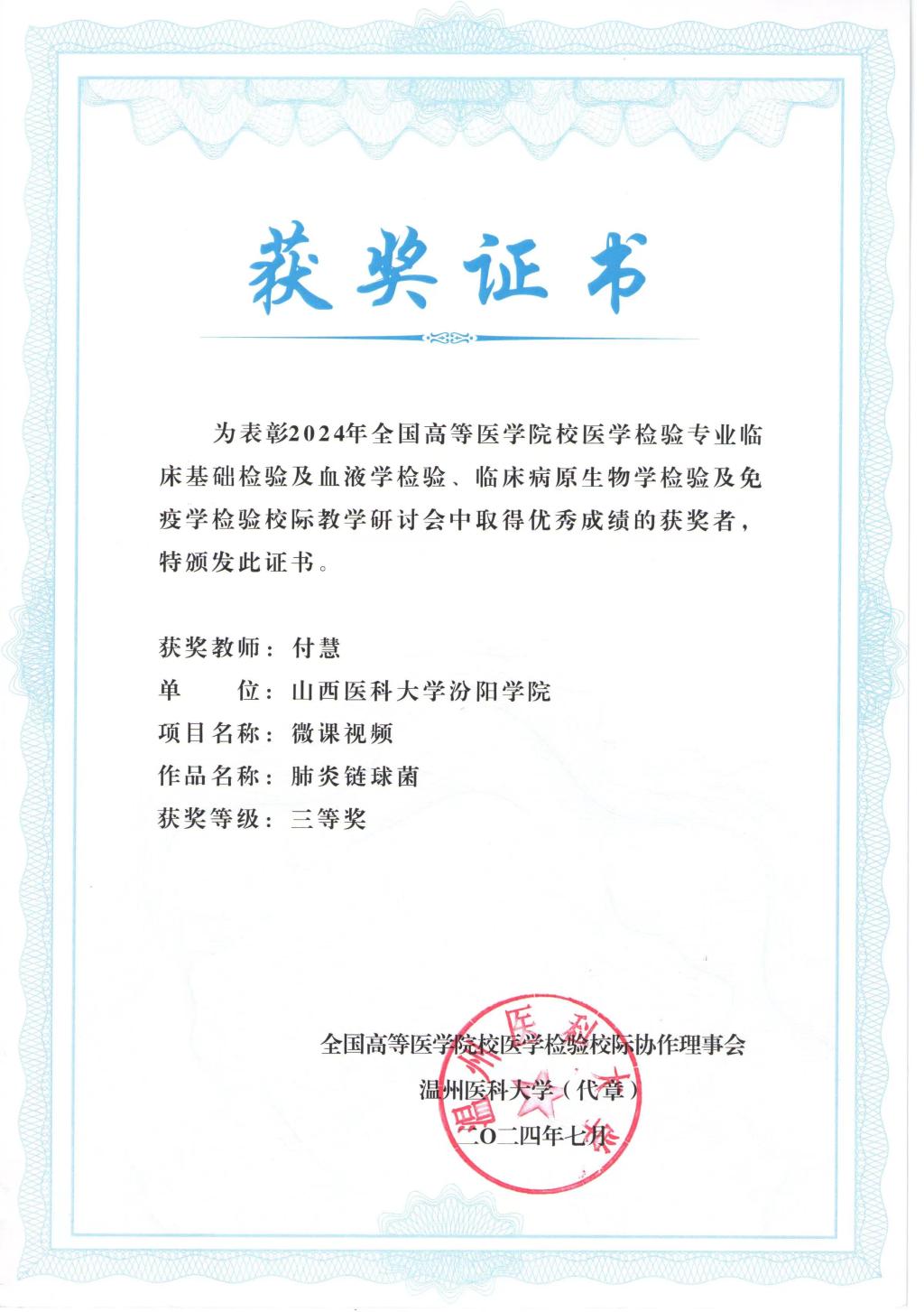7月11日至14日,由全国高等医学院校医学检验专业校际协作理事会主办,温州医科大学承办的“全国高等医学院校医学检验专业临床基础检验及血液学检验、临床病原生物学检验及免疫学检验校际教学研讨会”在温州召开。大会组织了会议论文、课程教学案例和微课比赛,必赢张晓延老师荣获会议论文一等奖、车昌燕老师荣获课程教学案例一等奖和会议论文二等奖、郝燕老师荣获课程教学案例二等奖、任吉莲和付慧老师荣获课程教学案例三等奖、李梦俊和付慧老师荣获微课比赛三等奖。