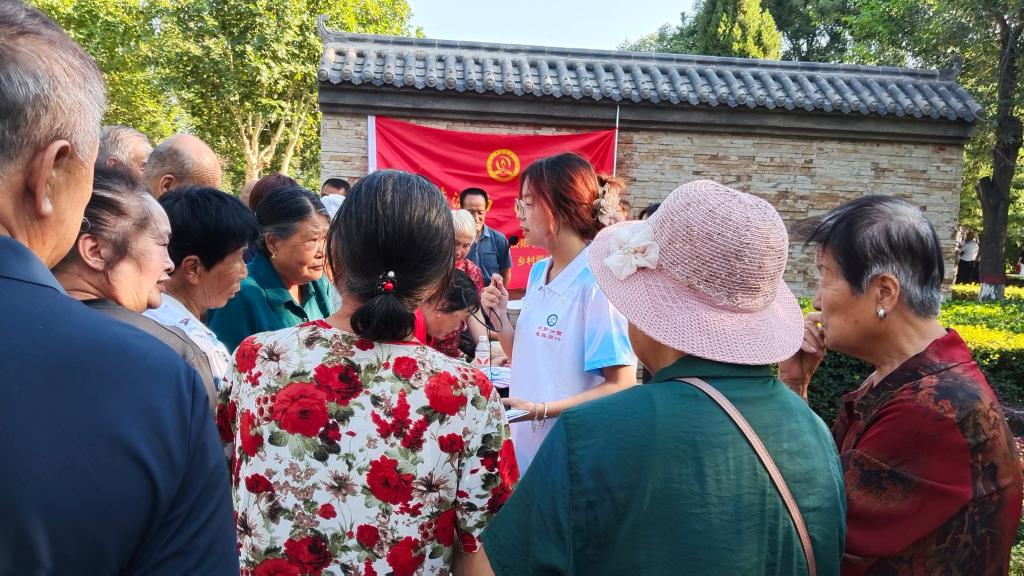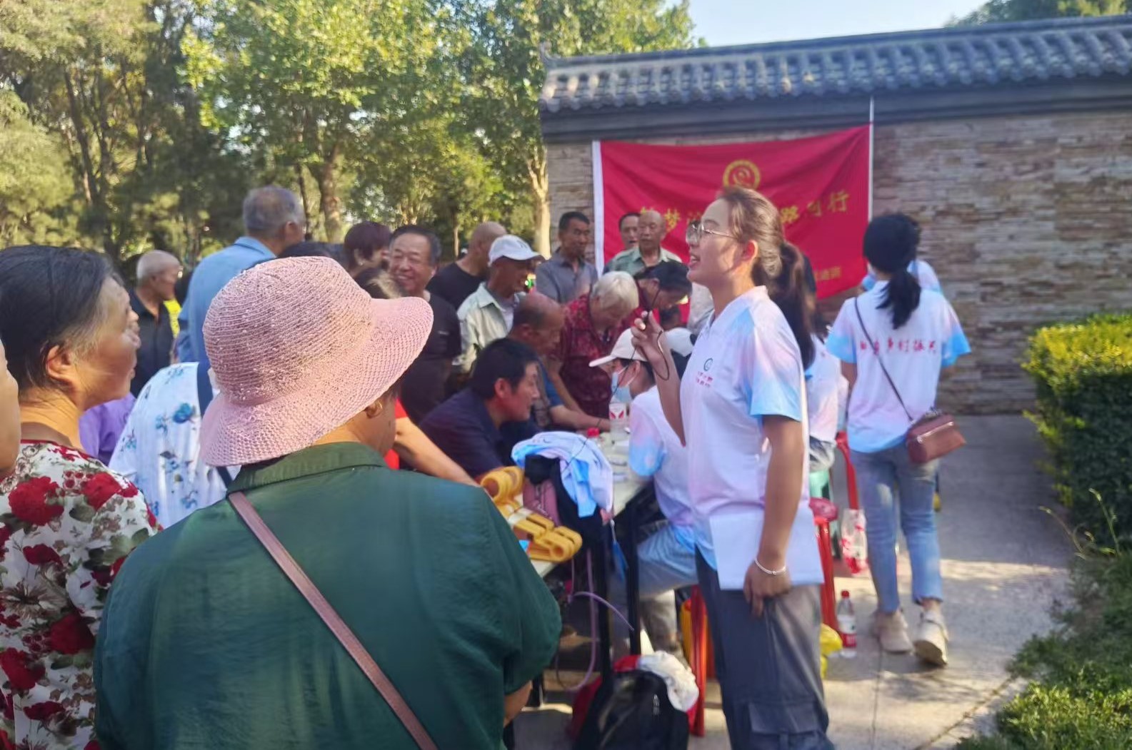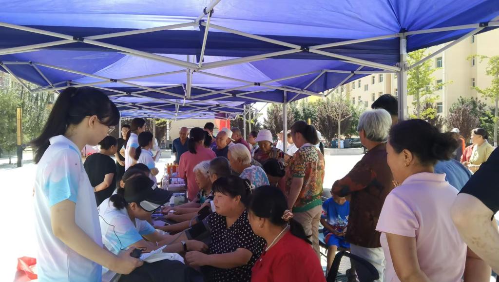 8月13日,同学们来到金凤社区(临汾市最大的移民搬迁小区)和人流密集的凤凰生态公园,为当地居民免费检测血压、血糖和身高体重,并提醒数据异常的中老年人及时就医或者调整生活方式。同时,在团队前期充分调查研究的基础上,采用通俗易懂的语言,针对高血压、糖尿病、心脑血管疾病等当地常见病对居民进行了全面的科普宣讲,并以趣味性互动问答的形式,激发当地老年人参与、学习和运用健康知识,增强健康意识,为促进农村健康事业发展贡献力量。