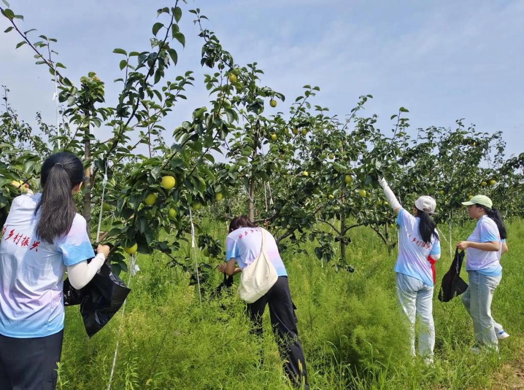 8月14日上午,团队成员乘车来到永安镇赵村垣千亩玉露香梨园。在梨园中,成员们与果农亲切交流,感受汾西县农业产业的发展变化,近距离了解玉露香梨的生长过程,学习相关农学知识。同时,自己动手操作,亲身体验果树拉枝、除草等劳动过程,体会劳动的辛劳与乐趣。