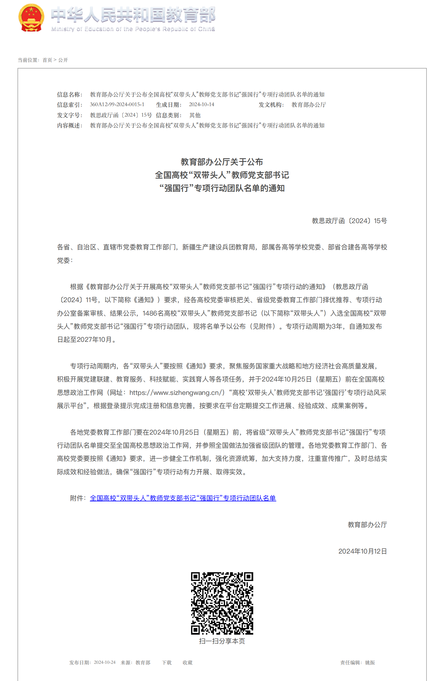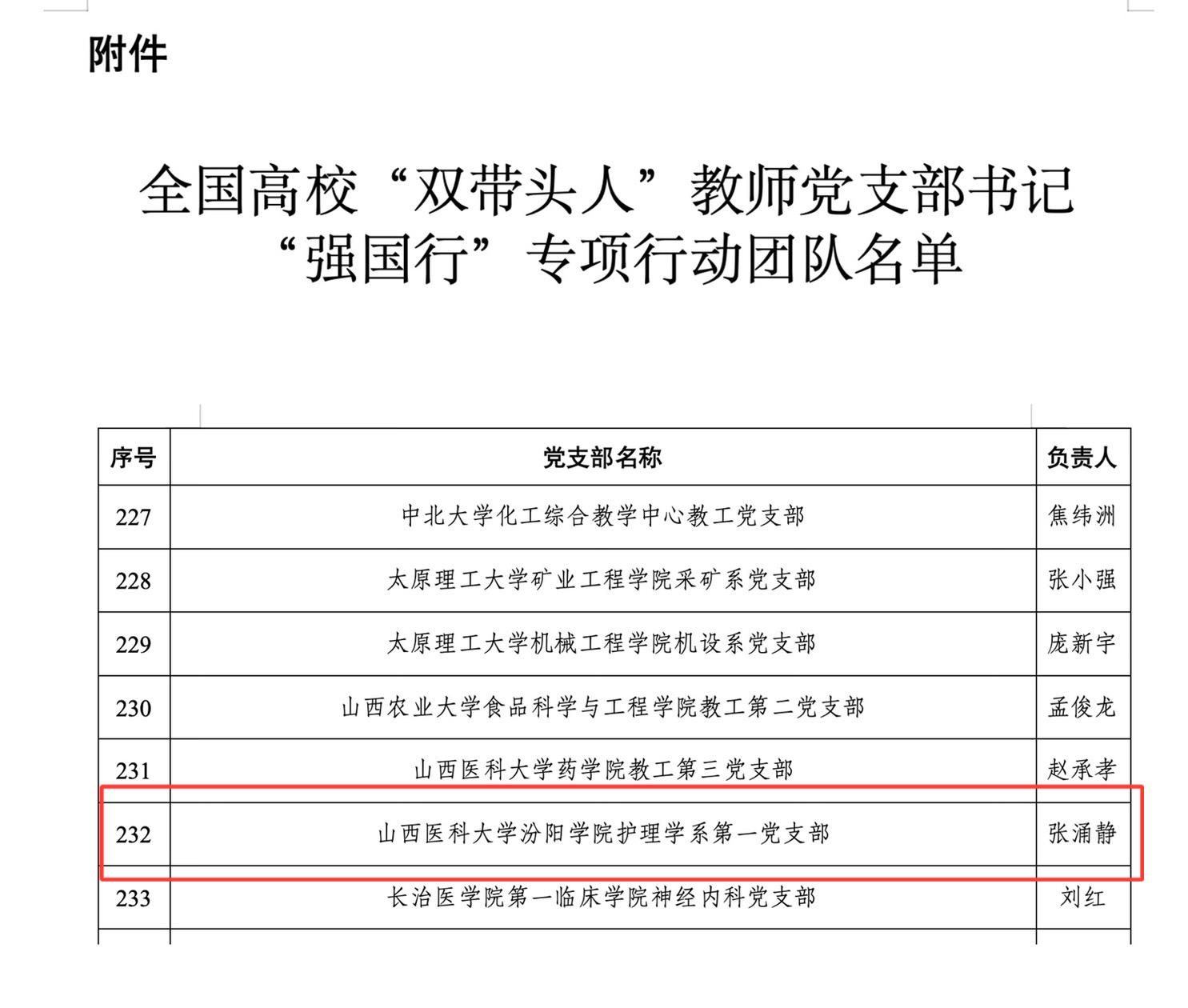 近日,教育部办公厅公布了全国高校“双带头人”教师党支部书记“强国行”专项行动团队名单,必赢护理学系党总支第一党支部入选。这是护理学系党总支第一党支部继获教育部首批“全国党建工作样板支部”、山西省委教育工委“两优一先”先进基层党组织称号后又一殊荣。
