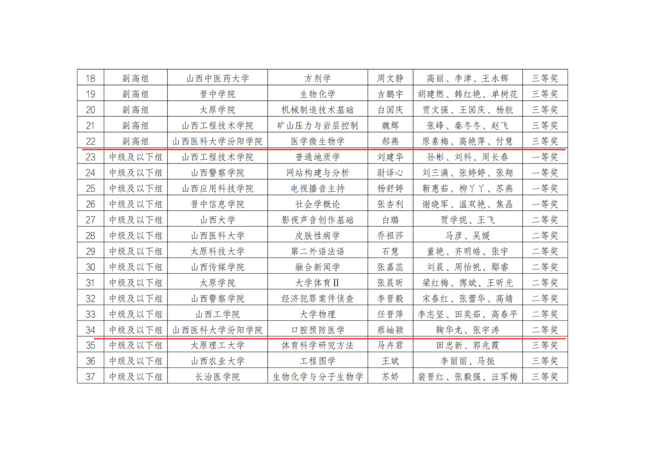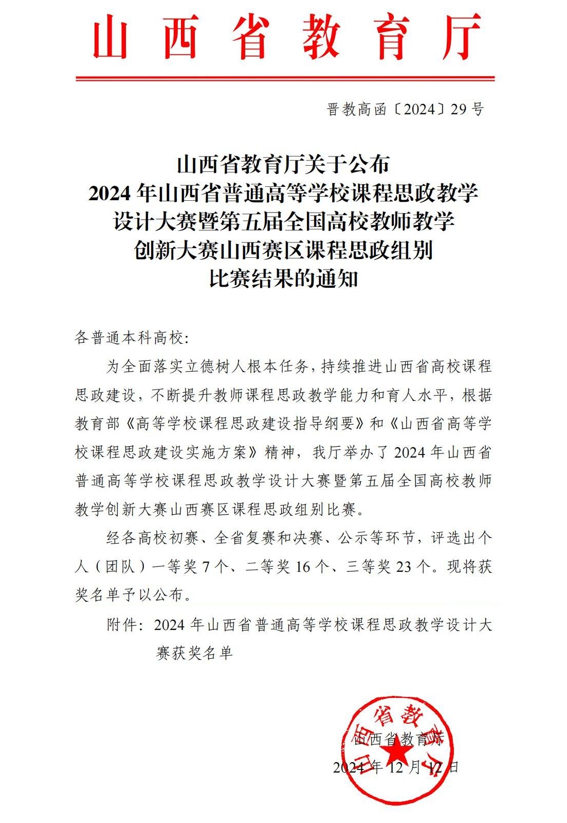 近日,山西省教育厅公布了2024年山西省普通高等学校课程思政教学设计大赛暨第五届全国高校教师教学创新大赛山西赛区课程思政组别比赛结果,必赢临床医学系蔡岫颖教师团队荣获中级及以下组二等奖,医学检验系郝燕教师团队荣获副高组三等奖。