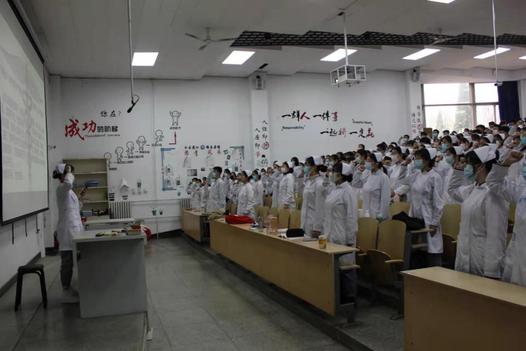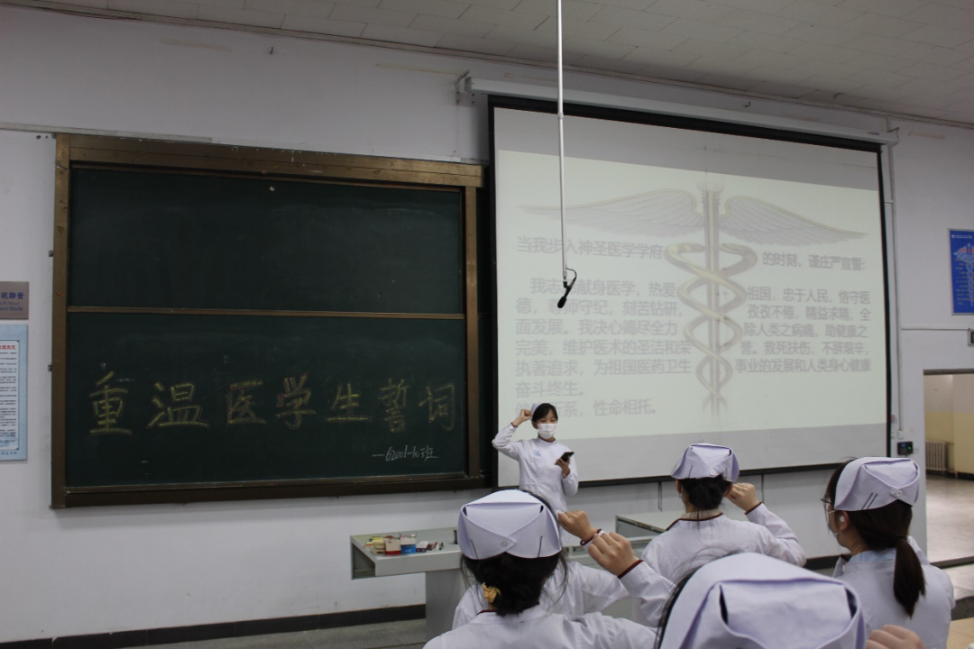 62001-10班3月24日下午于三阶一教召开“疫情当下,使命在肩”重温医学生誓词主题班会,会议由班长闫慧莲主持召开。教室里庄严肃穆,全体同学身着白色护士服庄严宣誓:“当我步入神圣医学学府的时刻……健康所系,性命相托”。闫慧莲同学铿锵有力地领誓,把同学们激情昂扬的情绪带到高潮。