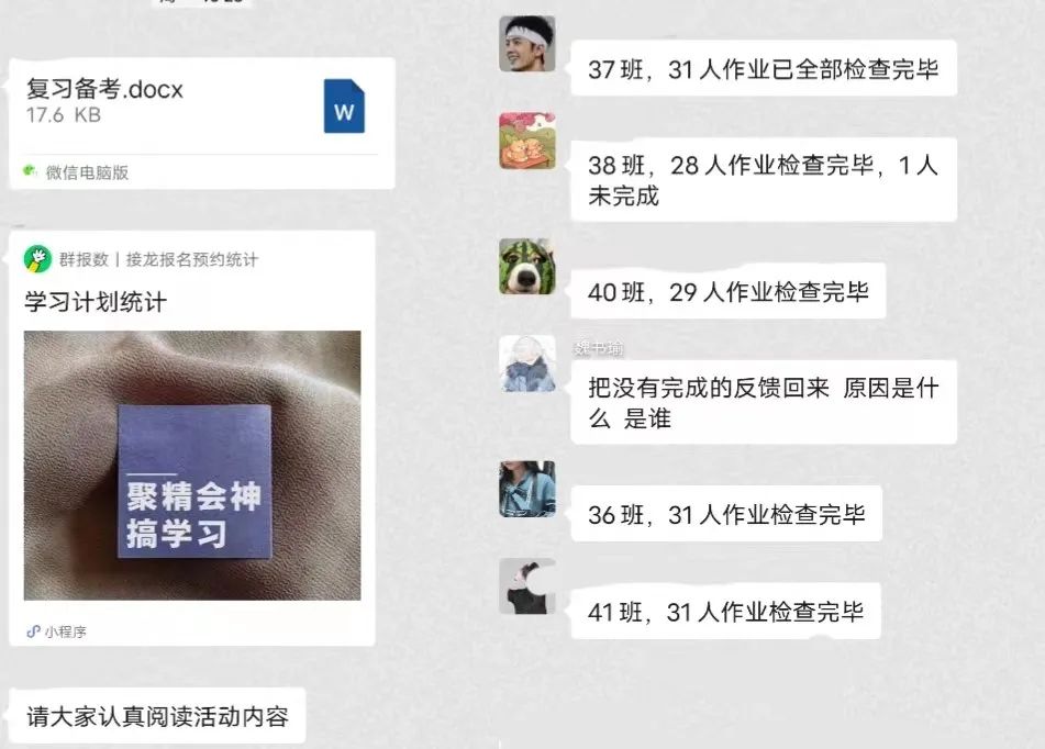 同学们参与学习活动的反馈结果由各小班学委收集统计、仔细核查,将结果及问题原因上报给大班学委。负责人将反馈数据进行分析综合,以数据图表的形式直观反馈班级学习面貌,附以文字叙述进行各小班学习情况反馈,罗列出优秀展品并公布在班级中供大家借鉴。最后将反馈结果递交给老师,层层把关,分工严密,待活动结束时根据反馈结果班级会赏罚分明,统一处理。