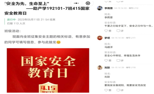 随后团总支书记闫宇萱同学又召开了以“安全为先,生命至上”为主题的班级活动,面向全体同学征集安全主题的相关标语,进一步提高了同学们对国家安全的理解和认知。