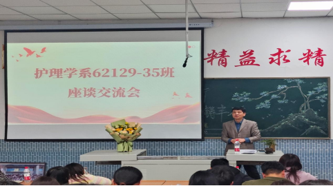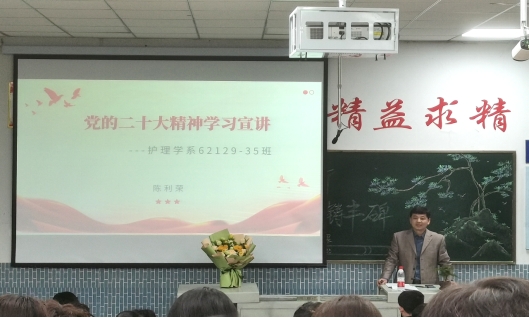 为深入学习宣传贯彻党的二十大精神,落实领导干部联系学生班级制度,进一步强化青年担当使命,3月24日晚,班级联系领导-临床医学系党总支书记陈利荣老师以“把握当下 肩负使命,奋楫扬帆再出发”为题,为护理学专业62129-35班学生讲授春季学期“开学第一课”,辅导员李丹、学业导师车莹参加。