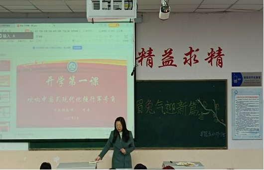 上好“开学第一课”,思政铸魂迎新篇。李丹老师首先作“吹响中国式现代化强行军号角”主题思想教育,通过学习“党的二十大”报告,引导学生明确政治立场,提高政治素养,并进一步阐明意识形态的重要性。她引用习近平主席金句寄语青年,希望同学们在新学期里可以明德立志、笃行不殆,敬终慎始。