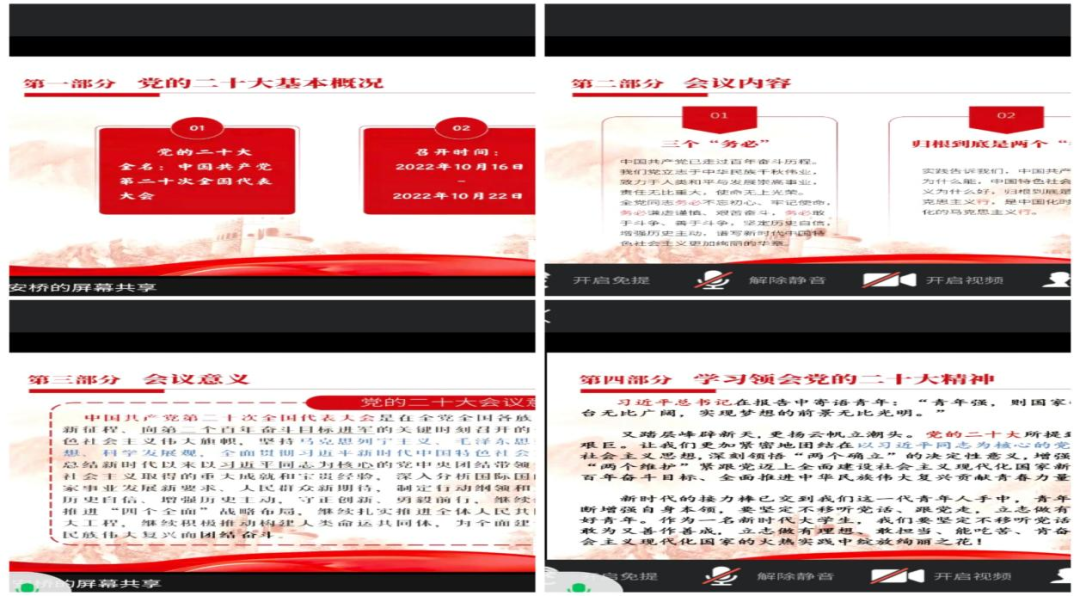 会上,闫宇萱同学带领同学们一起认真学习了党的二十大报告及相关文件精神,分别围绕三个“务必”,归根结底是“两个维护”,新时代新征程中国共产党的使命任务等主题深入学习,同学们就党的二十大精神学习心得体会进行了深入交流。