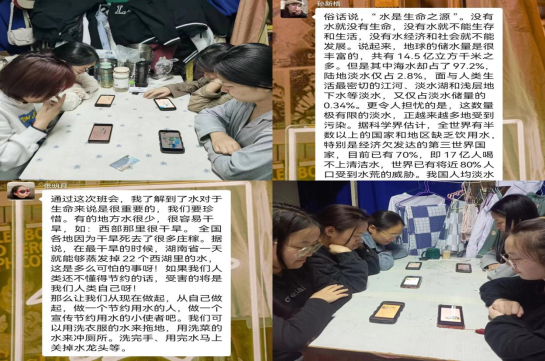 在班会最后,晋淑蓉同学给出了一个自查表,鼓励大家对照表格反思自己在日常生活中是否存在浪费水资源的现象,号召同学们可以从生活入手,在细微的小事中培养自己的节水意识,呼吁大家积极参与到节水活动中去。同学们也就此话题展开热议,纷纷表明自己参与节水活动的意愿与决心,同时愿意自觉肩负起青年人的使命,用实际行动带动和影响身边的人,争当节约用水的示范者和推动者。