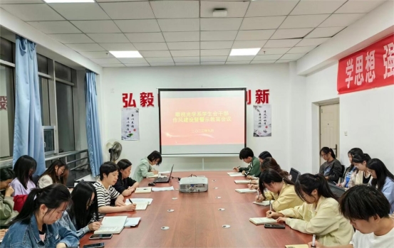 进一步引导青年学生干部树立正确的价值观、权力观,营造清廉学校建设浓厚氛围推动学校全面从严治党向纵深发展9月22日晚7:30,眼视光学系党总支在系会议室召开了眼视光学系学生会干部作风建设暨警示教育会议。党总支书记岳永红副书记张华分团委书记阎艳萍及系学生会全体成员加了会议