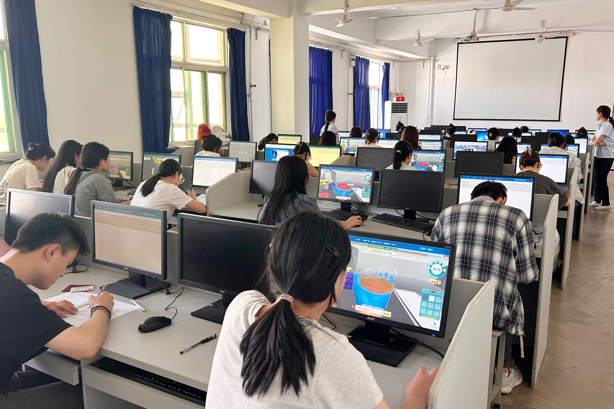 上午8时,大赛分别在诚明楼医学检验系实验室和聚成楼计算机教室进行,校党委委员、副院长陈振文和医学检验系党政领导现场观摩。比赛中,各组评委老师对照评分标准严肃认真评判。选手们操作准确专业,展现了同学们的专业知识积累、实验操作能力及良好的比赛心态。