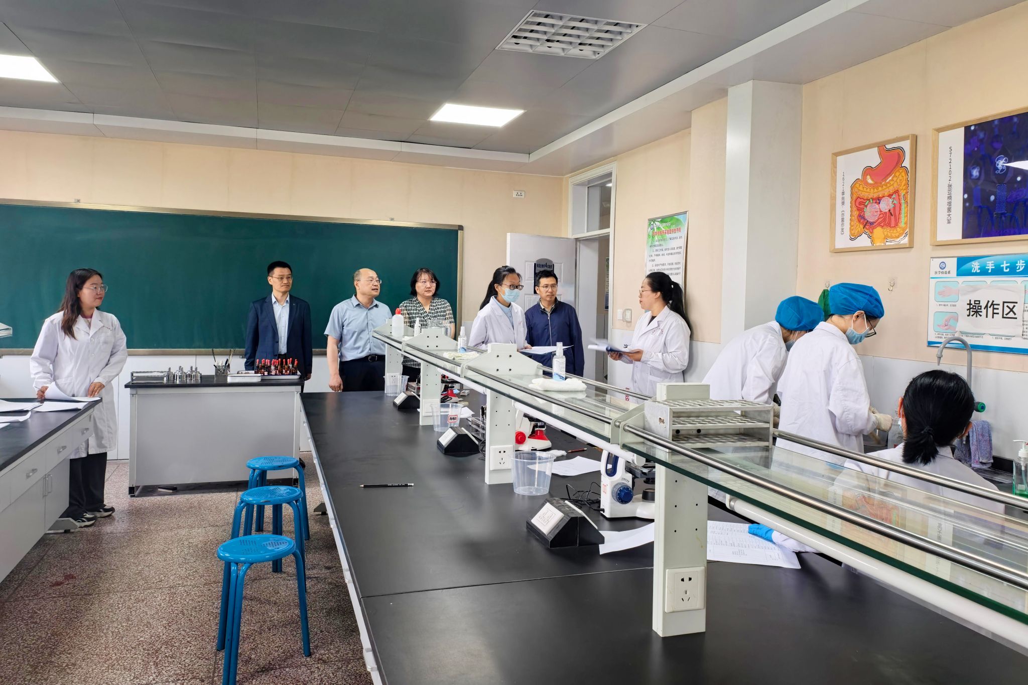 本次大赛分设七个项目组:实验诊断组、形态组、生检组、免检组(参赛学生为722班、s724班);微检组、临检组(参赛学生为723班);化学组(参赛学生为724班)。赛前,各组教师对选手进行操作指导,强化训练,使参赛的同学对实验流程以及比赛内容有了充分的了解和掌握。通过初赛筛选,共确定108名学生参加各项目组的决赛。