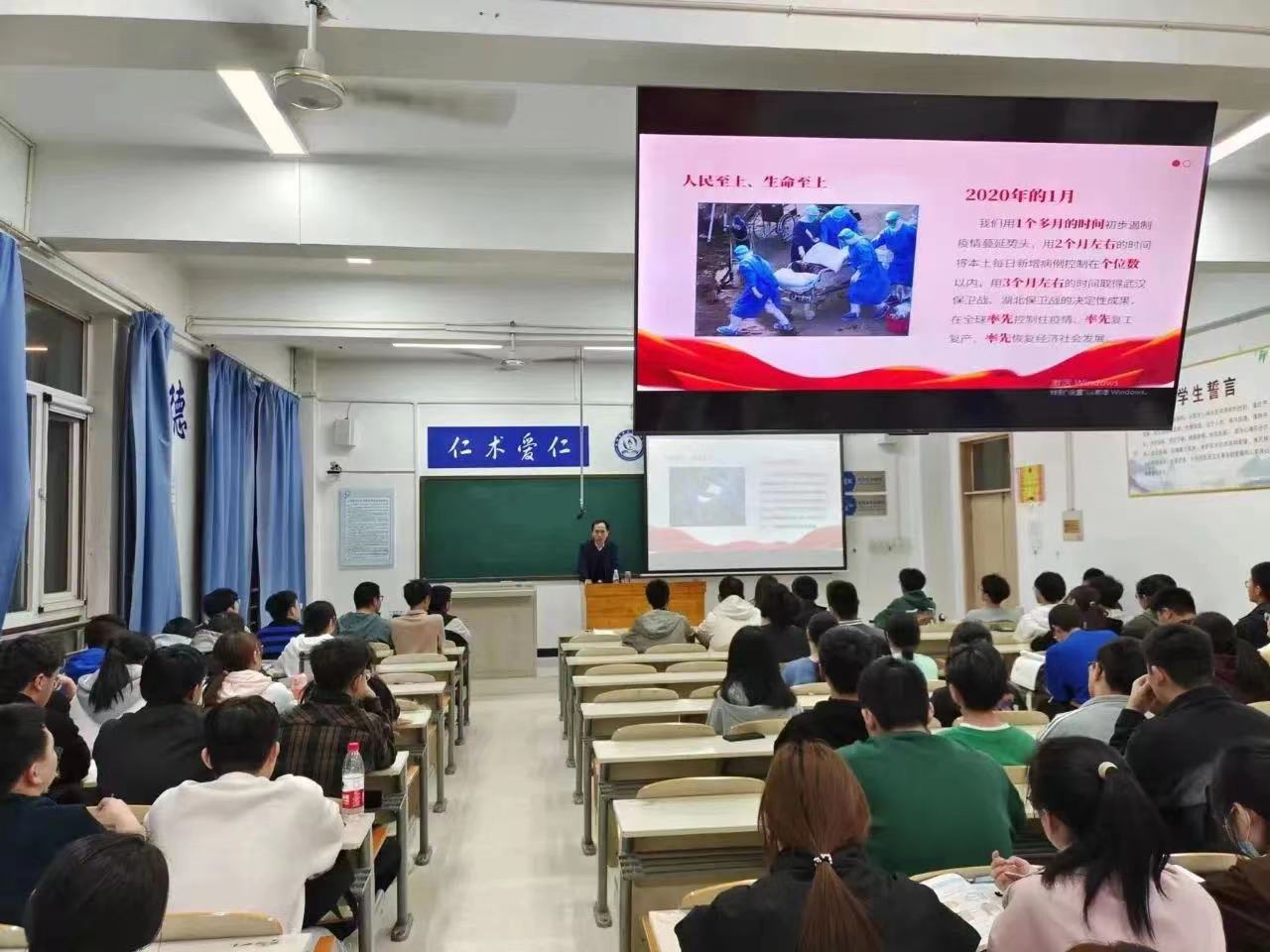 李荣江副院长首先回顾了疫情发生以来,全国各族人民在以习近平同志为核心的党中央的集中统一领导下,打赢了一场疫情防控的人民战争。在这场同严重疫情的殊死较量中,勤劳勇敢的中国人民以敢于斗争、敢于胜利的大无畏气概,铸就了生命至上、举国同心、舍生忘死、尊重科学、命运与共的伟大抗疫精神。李荣江副院长还大力赞扬汾院学子同心协力的志愿工作,也教会同学们热爱生命,敬畏生命,强身健体,培养积极乐观的品质。