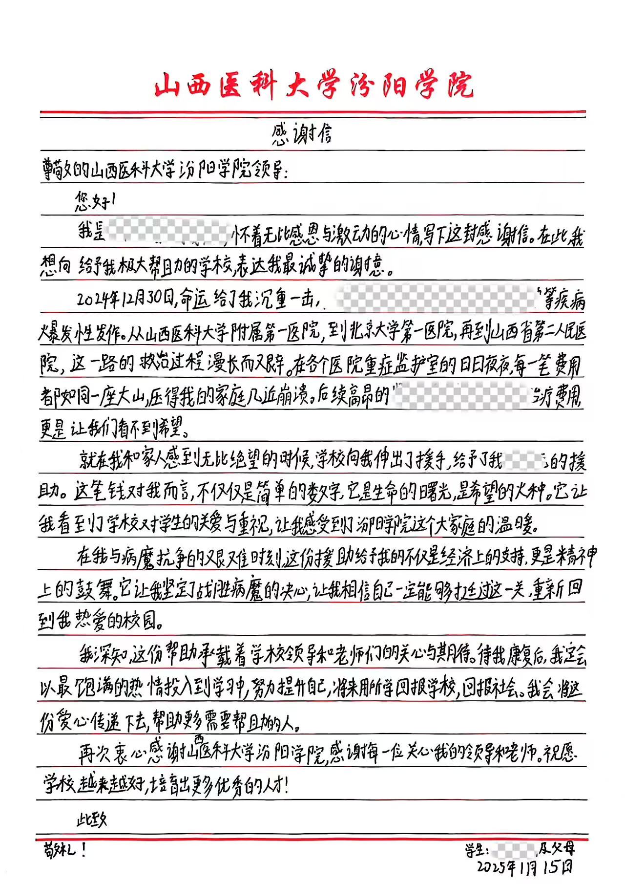 受助同学及家长发来感谢信向学校及师生和社会爱心人士表达了感激之情。