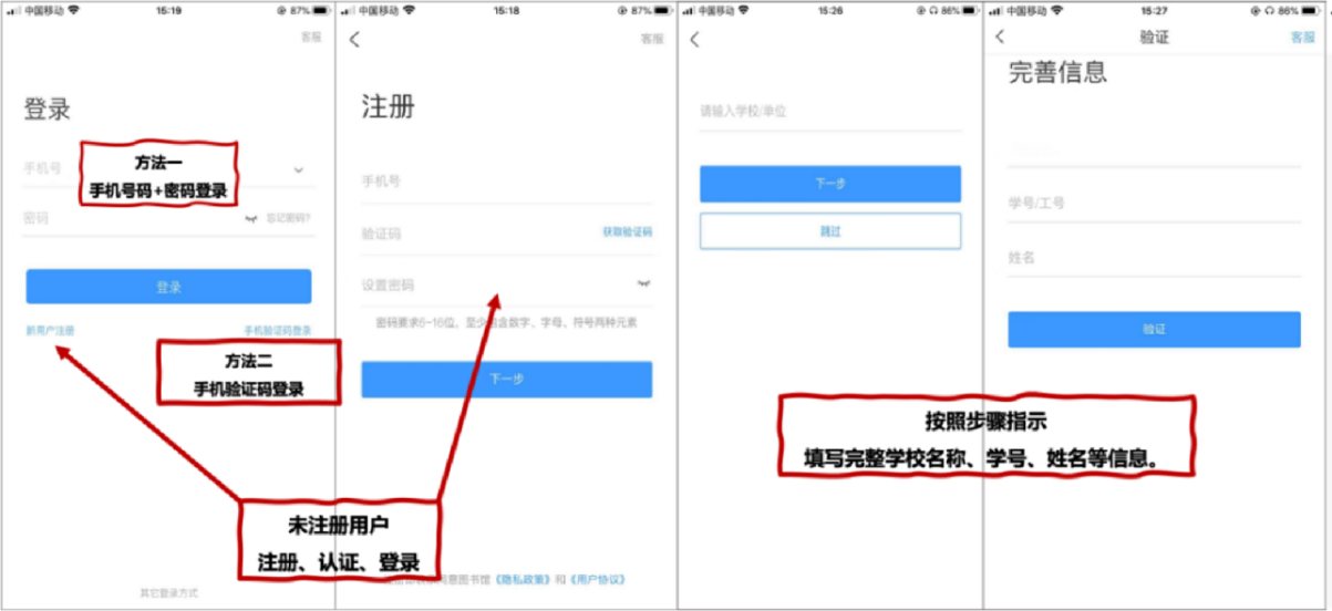 2.未注册用户:下载“超星学习通”后点击该APP进入登录页面,点击【新用户注册】进入注册页面,填写您的【手机号】,获取验证码并填写,设置登录密码后,点击【下一步】,输入并选择您的【学校单位】,完善您的学号、姓名等信息进行验证。