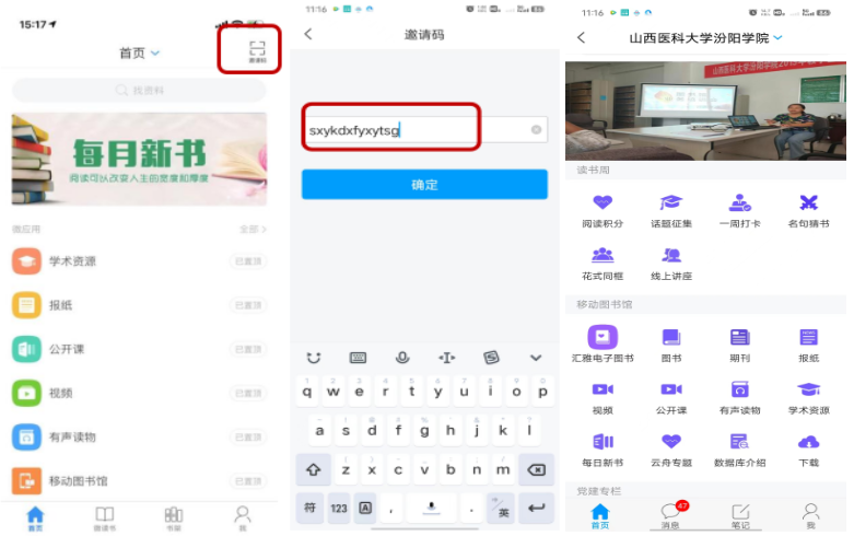 点击学习通首页右上方邀请码,输入邀请码“sxykdxfyxytsgx”(山西医科大学汾阳学院图书馆首字母小写)进入图书馆首页,了解更多图书馆定制服务。