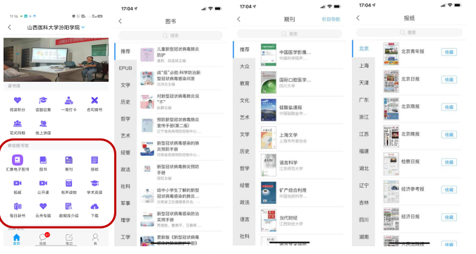 1.移动图书馆:为读者提供了百万种中文电子图书,百余种报纸,视频、音频资源两千余系列;读者直接点击“图书”“期刊”“报纸”等即时阅读,可进入“学术资源”检索并获取自己所需要的资源。