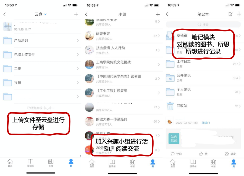 3、“我”的模块:集中管理读者相关信息。您可看到自己收藏的资源、创作的专题、云盘内的资料、加入的小组以及笔记等。