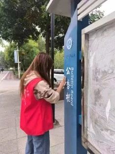 活动中,志愿者们分为11小组,分别进行校园定点清扫,捡拾绿化带里的杂物、擦拭公告栏、清理操场旁有无物品售卖的商家收款码以及清理菜鸟驿站周边垃圾等。