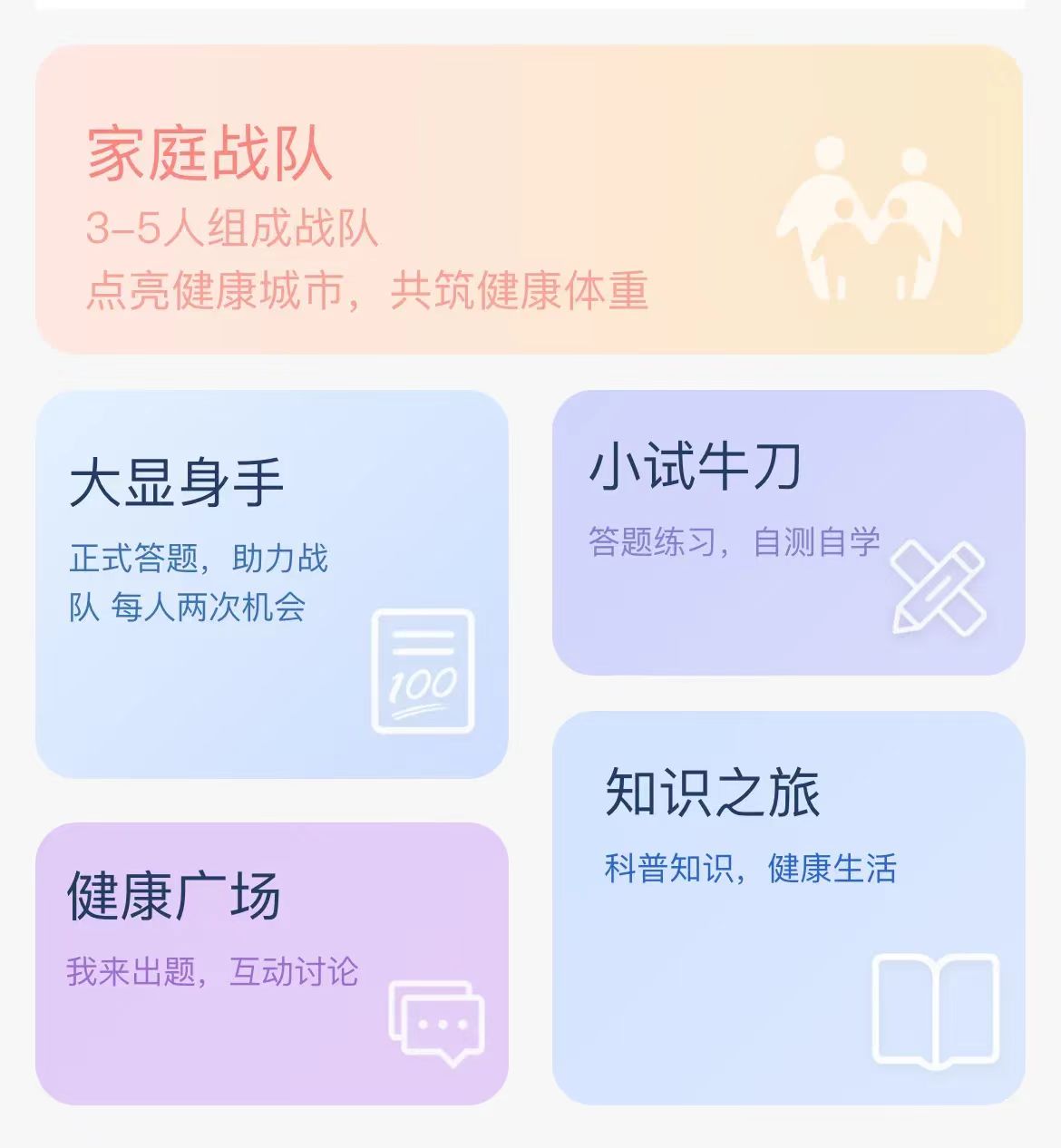 线上答题小程序分为“小试牛刀、大显身手、健康广场、知识之旅、家庭战队”5个板块,同时,小程序设置了助力打卡功能。