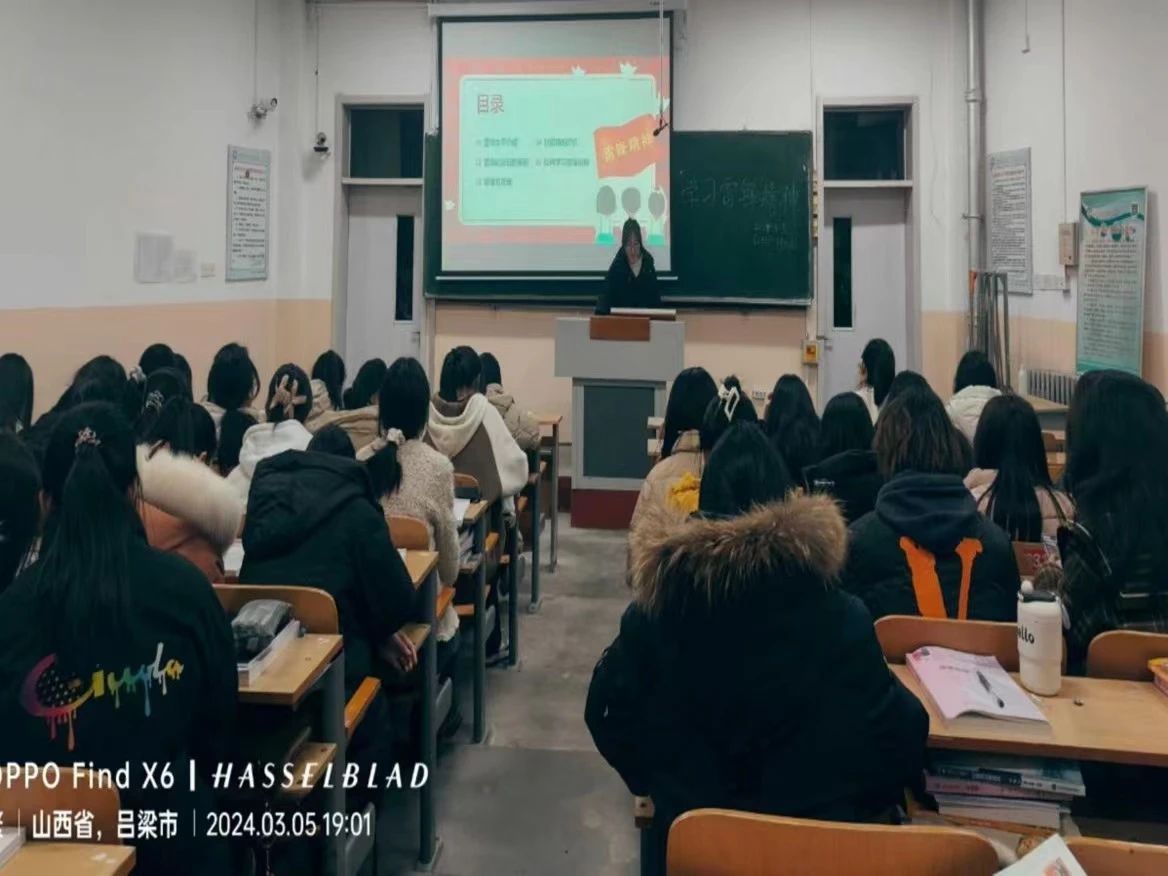 3月5日,护理学系62331-33班于一阶一教开展学习雷锋精神主题班会。此班会分为雷锋的生平介绍、雷锋纪念日的来历、雷锋名言录、对雷锋的评价以及如何学习雷锋精神五部分进行,使同学们在生活中乐于助人,甘于奉献,以主人翁的精神来为班集体、为其他同学、为学校贡献自己的力量,让班集体成为朝气蓬勃的和谐集体。