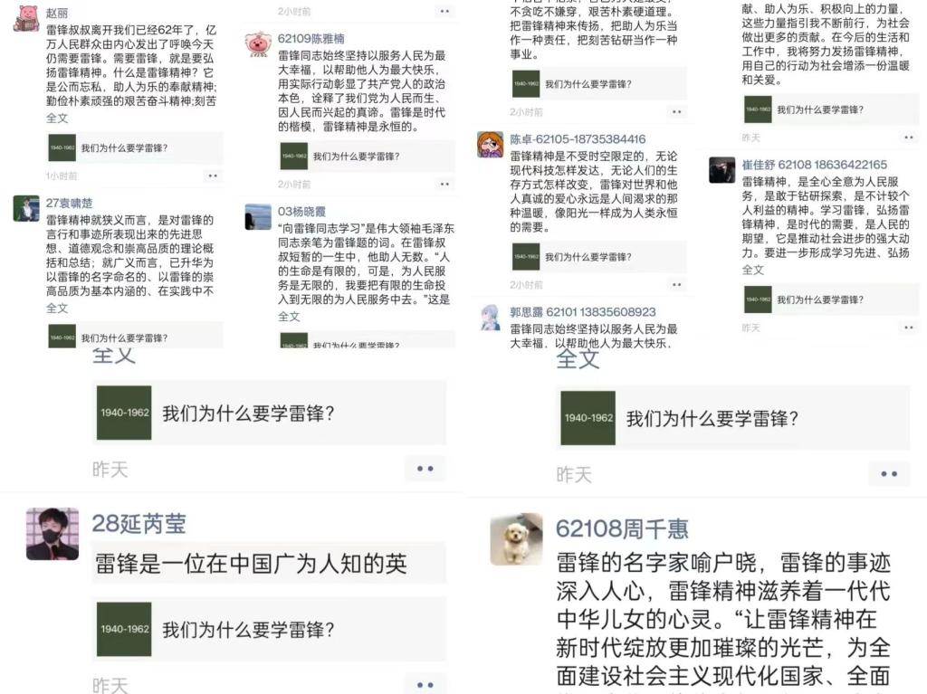 3月6日,62101-10班在辅导员王敏敏老师的指导下开展了雷锋主题系列活动。在组织委员张丽霞的带领下,同学们认真研读有关雷锋精神的相关文章,进一步深刻领悟到了雷锋精神的内涵,并在朋友圈发表自己的所思所悟。